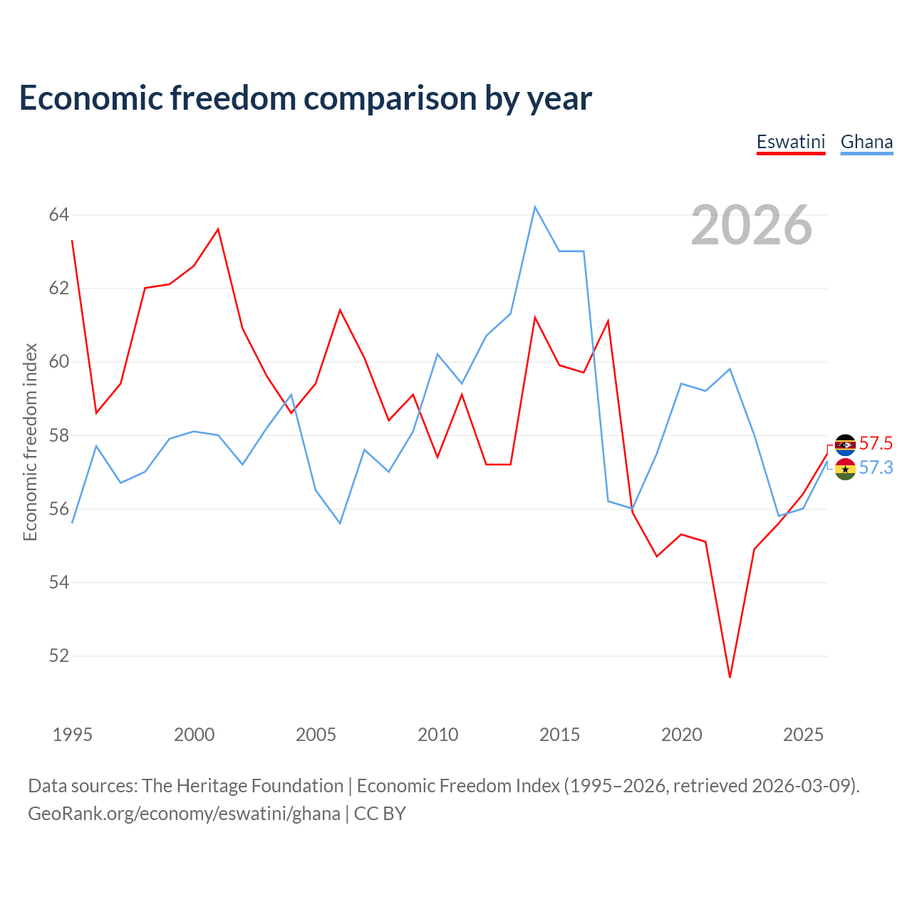 The Economic Freedom Index for Eswatini is 57.5, ranking 116/197, compared to 57.3 for Ghana, ranking 118/197. The chart above displays a comparison of annual changes in economic freedom indexes.