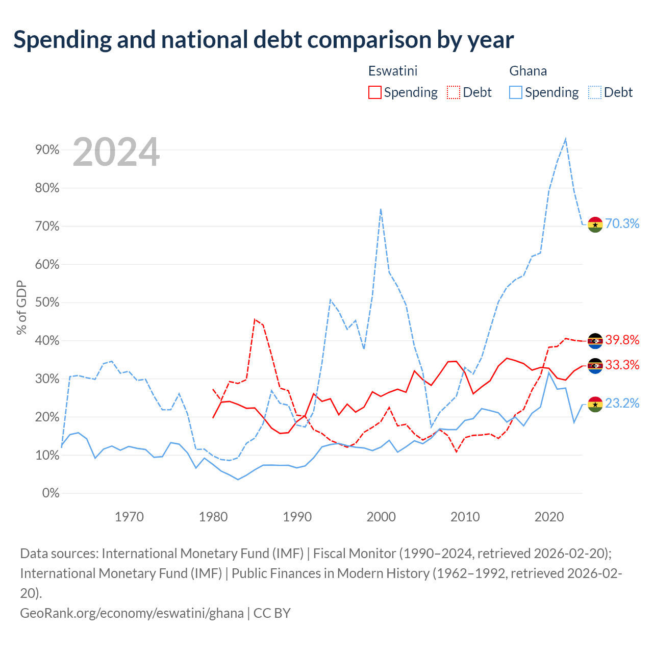 Eswatini has $1.93B in government debt (39.8% of GDP), compared to $57.9B (70.3% of GDP) in Ghana.