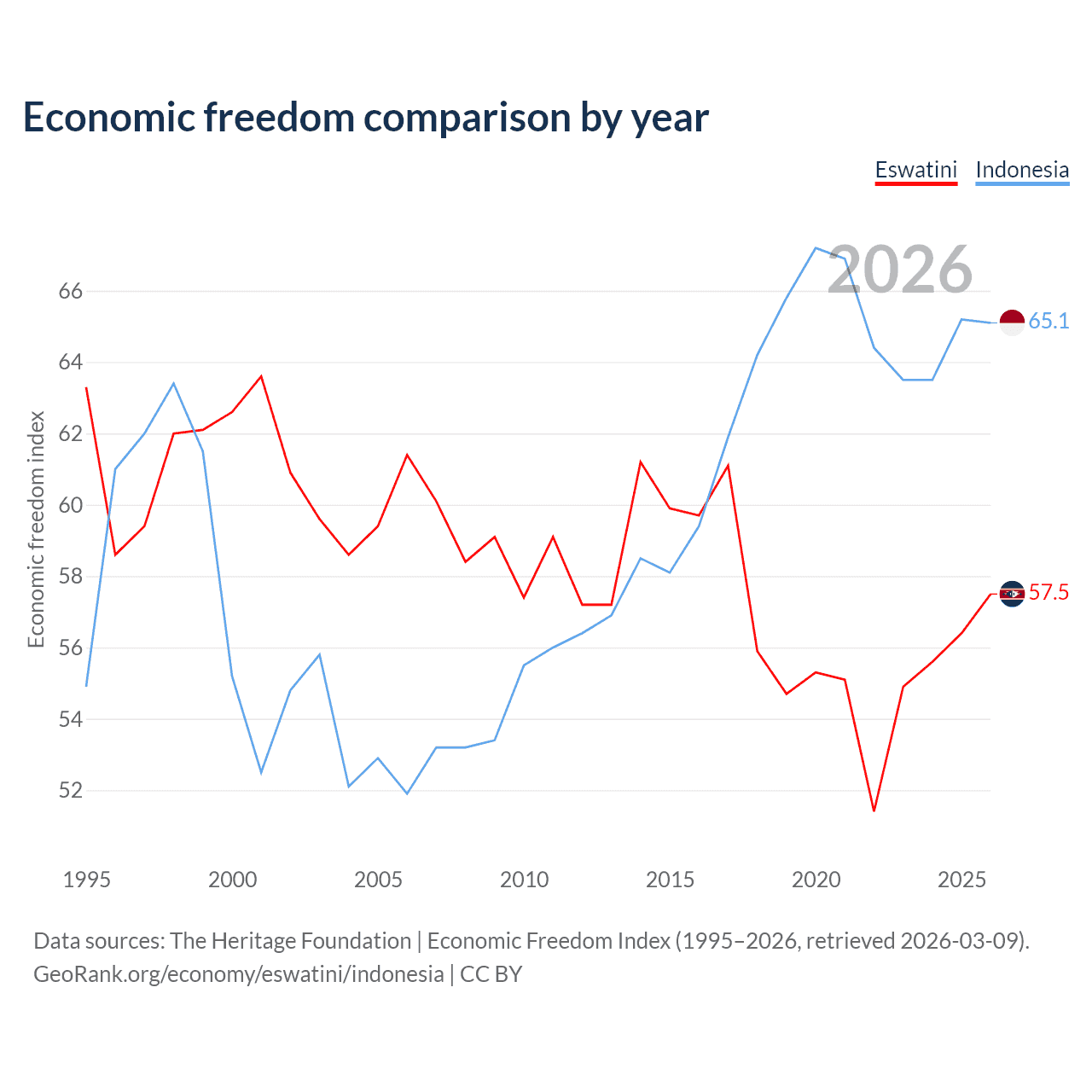The Economic Freedom Index for Eswatini is 57.5, ranking 116/197, compared to 65.1 for Indonesia, ranking 67/197. The chart above displays a comparison of annual changes in economic freedom indexes.