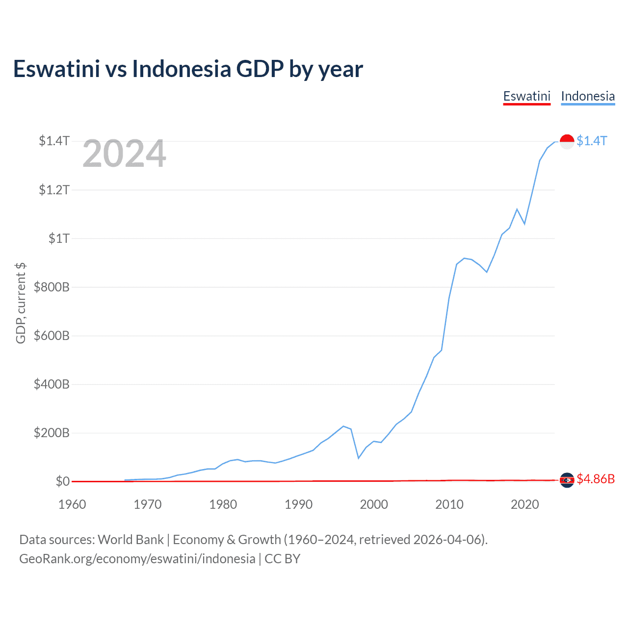 Eswatini has a GDP of $4.86B compared to $1.4T for Indonesia, ranking 162/197 and 16/197 by economy size, respectively.