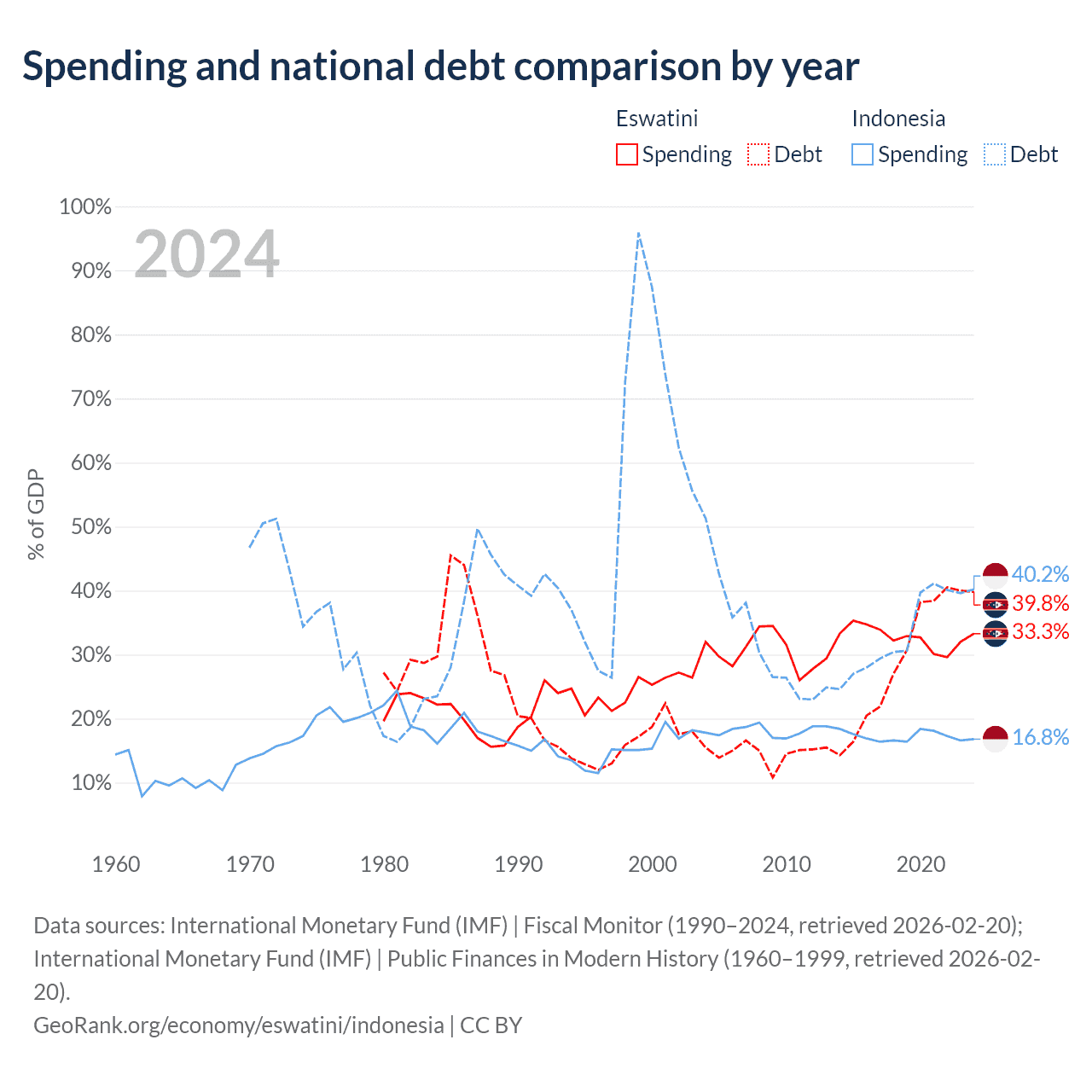 Eswatini has $1.93B in government debt (39.8% of GDP), compared to $561B (40.2% of GDP) in Indonesia.