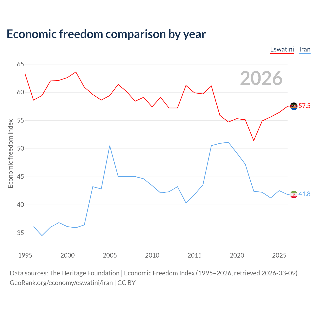 The Economic Freedom Index for Eswatini is 57.5, ranking 116/197, compared to 41.8 for Iran, ranking 185/197. The chart above displays a comparison of annual changes in economic freedom indexes.