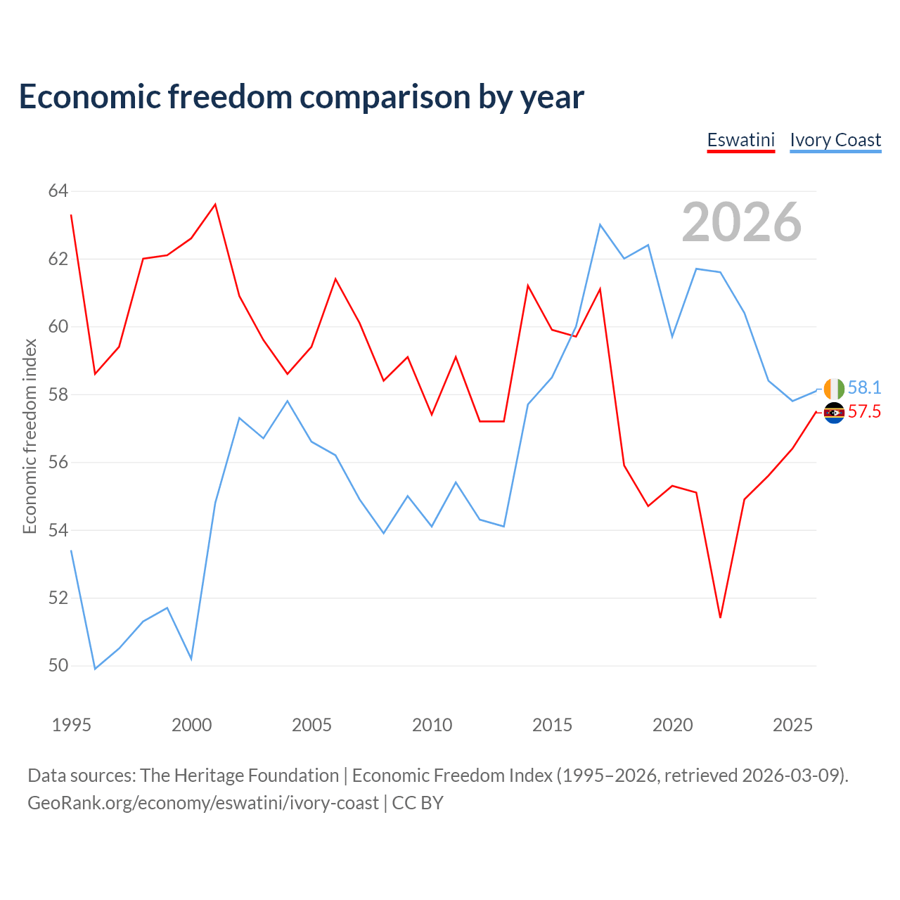 The Economic Freedom Index for Eswatini is 57.5, ranking 116/197, compared to 58.1 for Ivory Coast, ranking 111/197. The chart above displays a comparison of annual changes in economic freedom indexes.