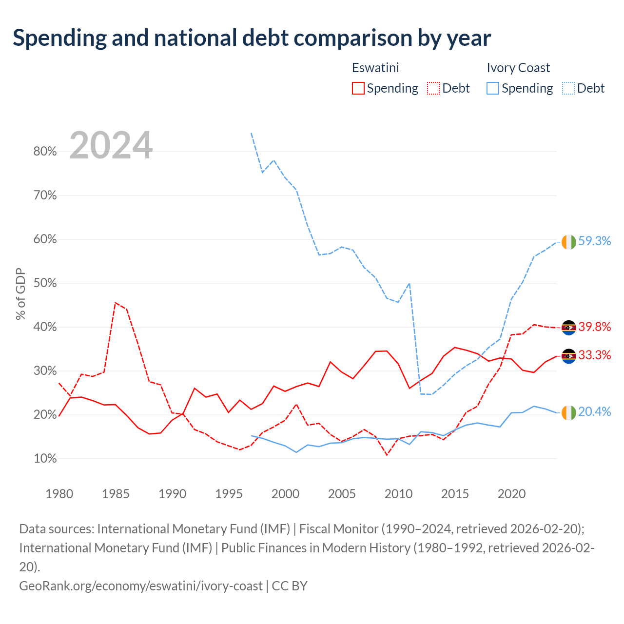 Eswatini has $1.93B in government debt (39.8% of GDP), compared to $51.6B (59.3% of GDP) in Ivory Coast.