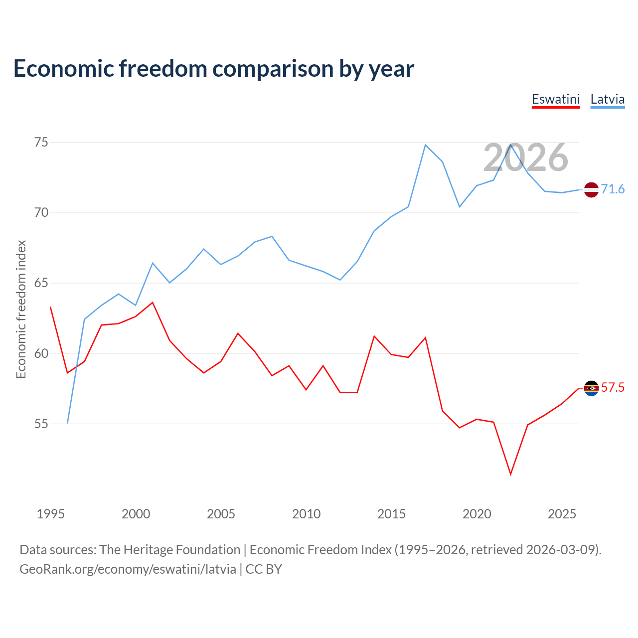 The Economic Freedom Index for Eswatini is 57.5, ranking 116/197, compared to 71.6 for Latvia, ranking 31/197. The chart above displays a comparison of annual changes in economic freedom indexes.
