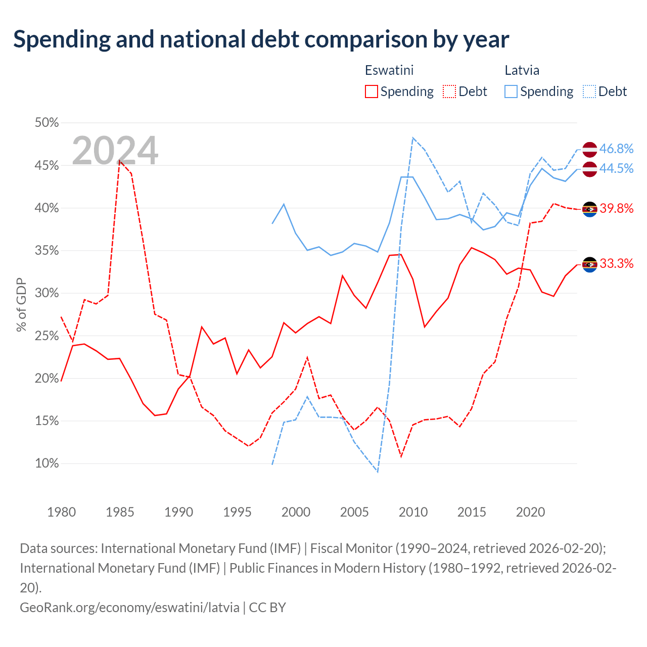 Eswatini has $1.93B in government debt (39.8% of GDP), compared to $20.4B (46.8% of GDP) in Latvia.