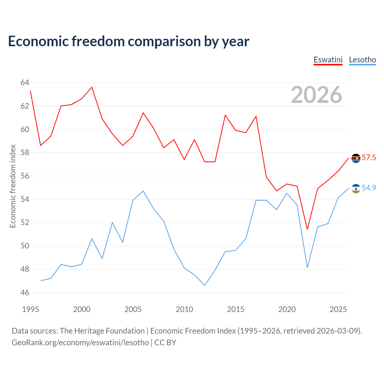 The Economic Freedom Index for Eswatini is 57.5, ranking 116/197, compared to 54.9 for Lesotho, ranking 130/197. The chart above displays a comparison of annual changes in economic freedom indexes.