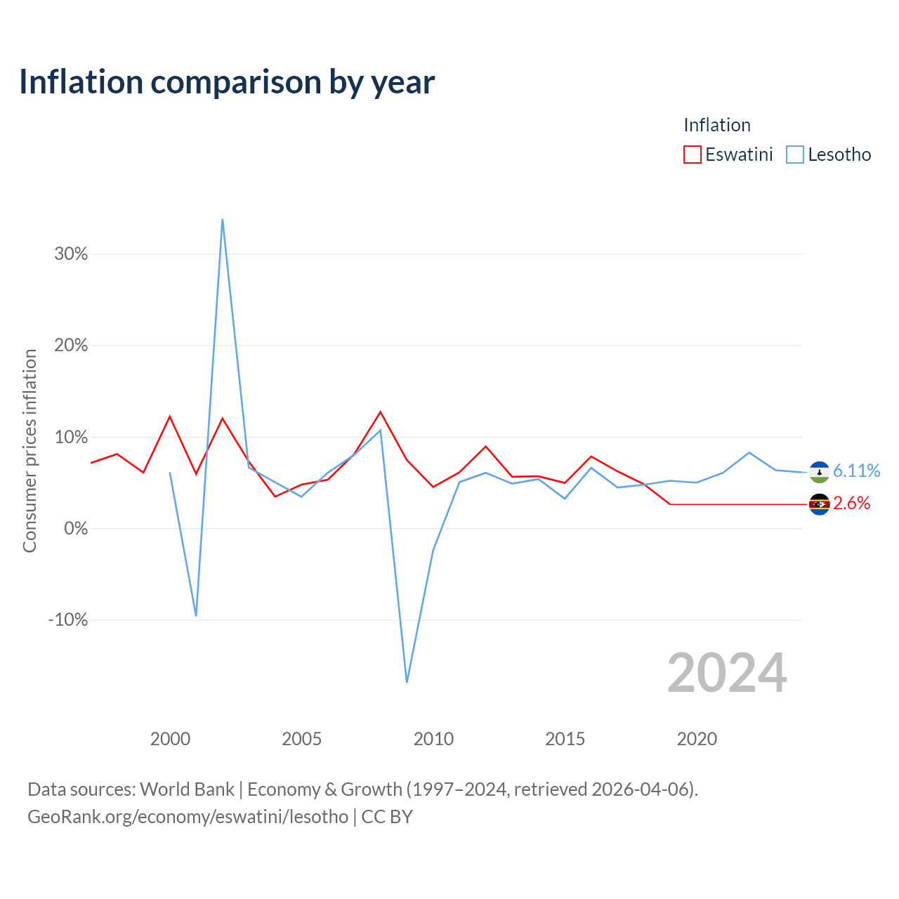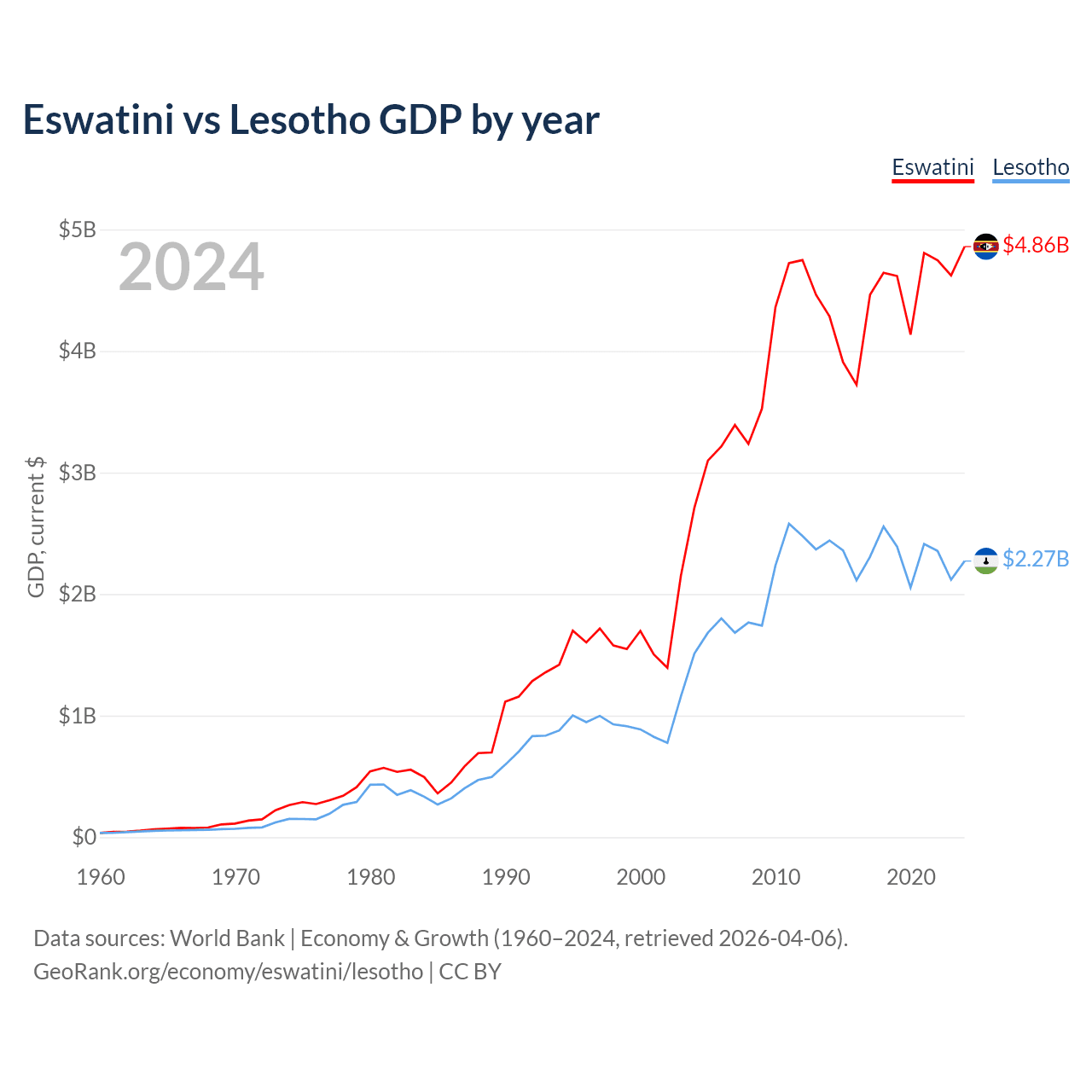 Eswatini has a GDP of $4.86B compared to $2.27B for Lesotho, ranking 162/197 and 175/197 by economy size, respectively.