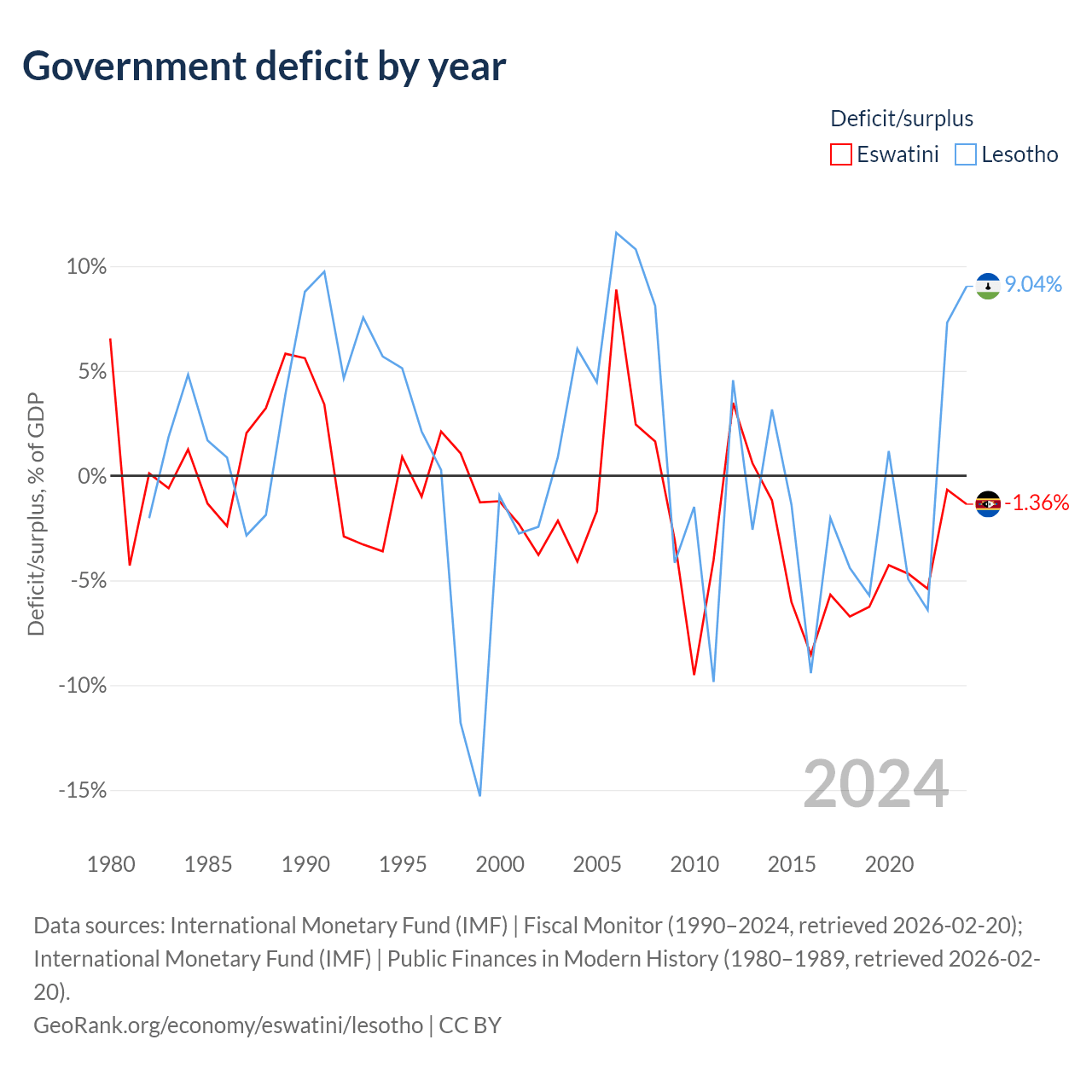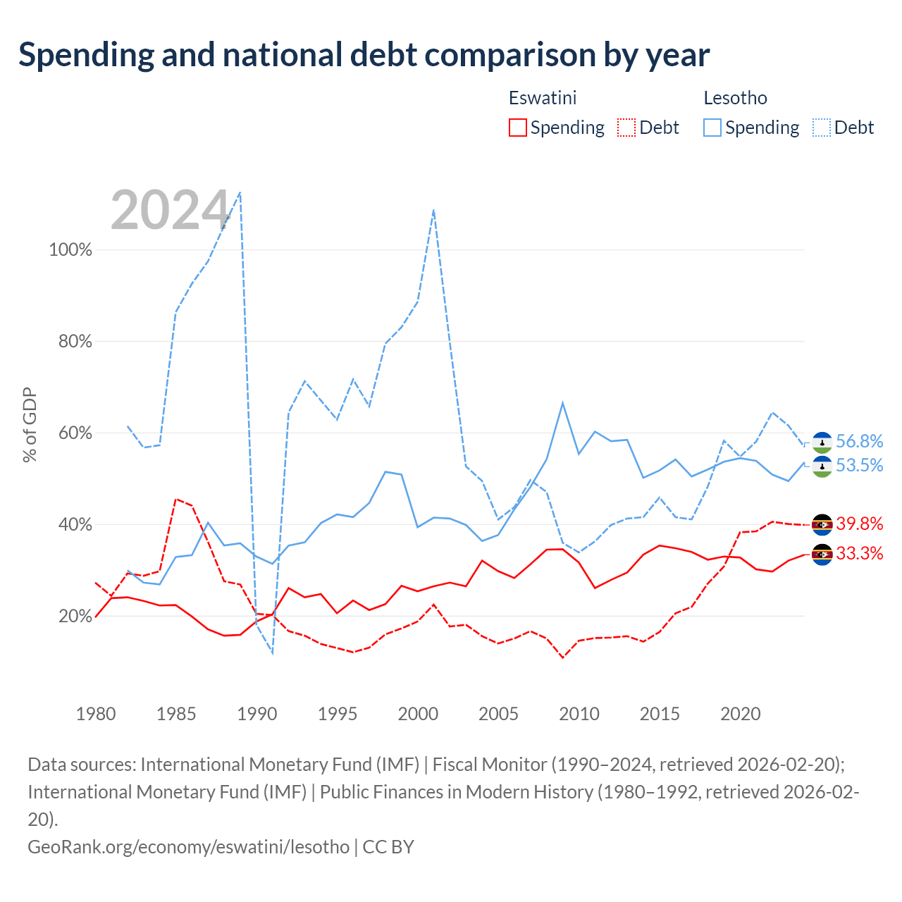 Eswatini has $1.93B in government debt (39.8% of GDP), compared to $1.29B (56.8% of GDP) in Lesotho.