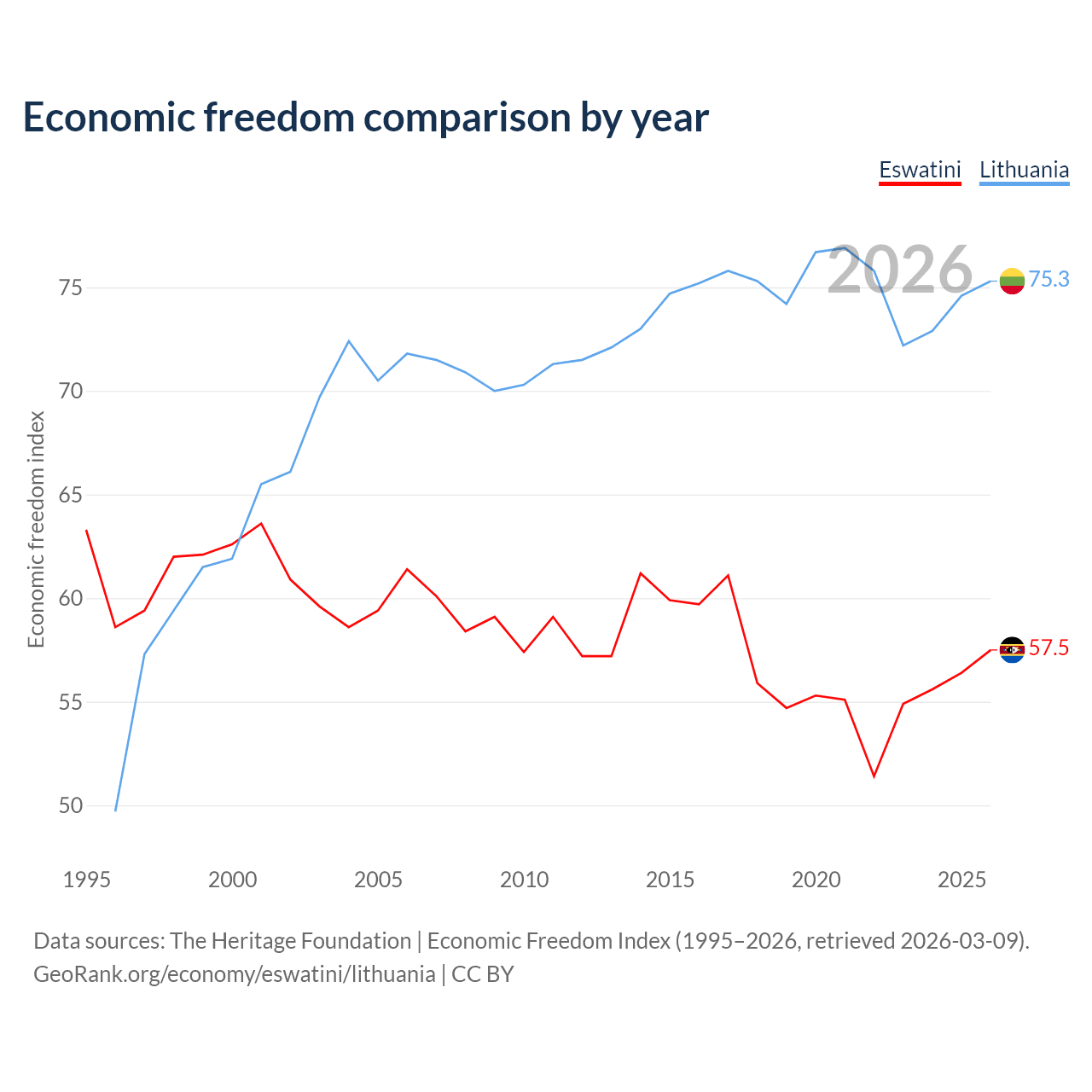 The Economic Freedom Index for Eswatini is 57.5, ranking 116/197, compared to 75.3 for Lithuania, ranking 18/197. The chart above displays a comparison of annual changes in economic freedom indexes.
