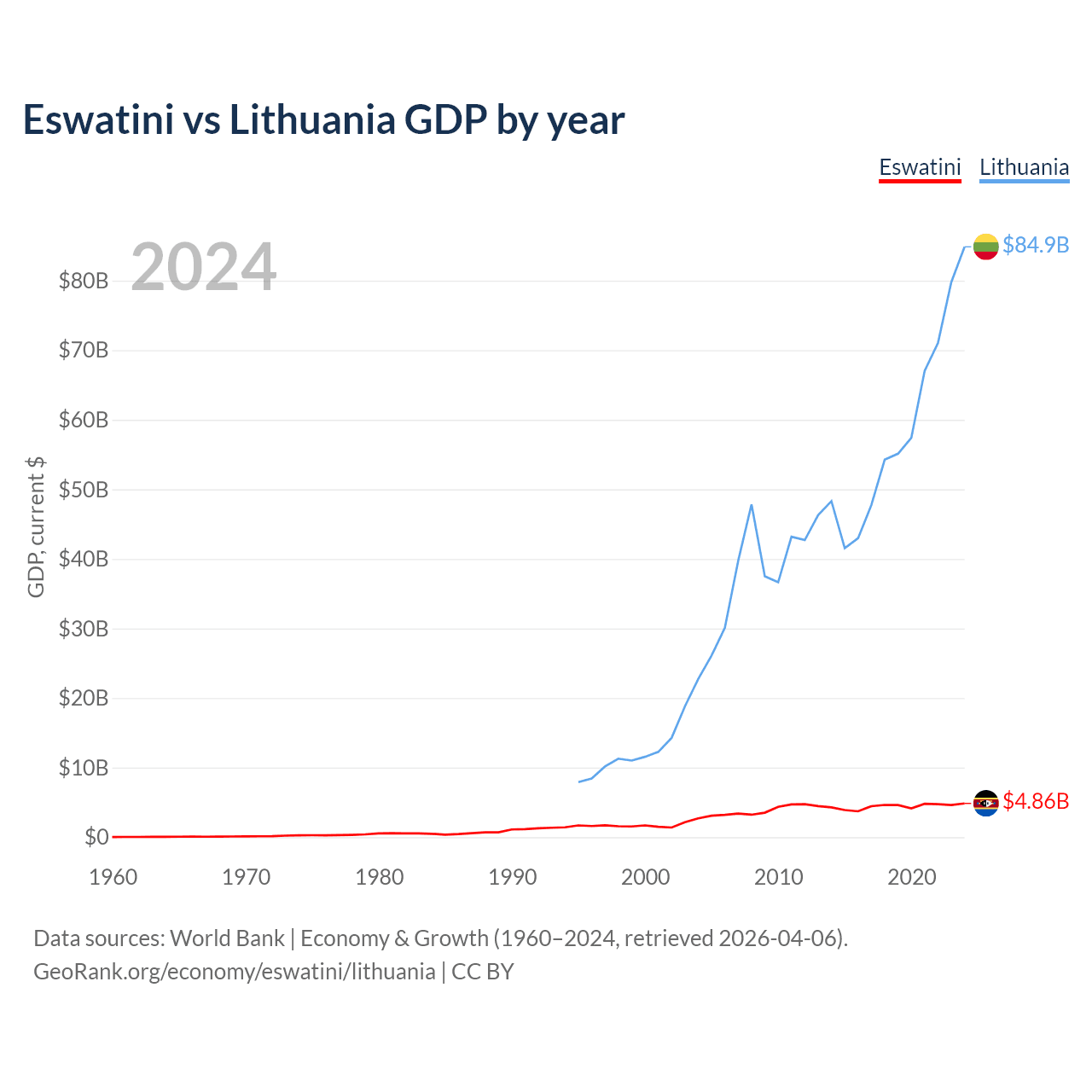 Eswatini has a GDP of $4.86B compared to $84.9B for Lithuania, ranking 162/197 and 79/197 by economy size, respectively.