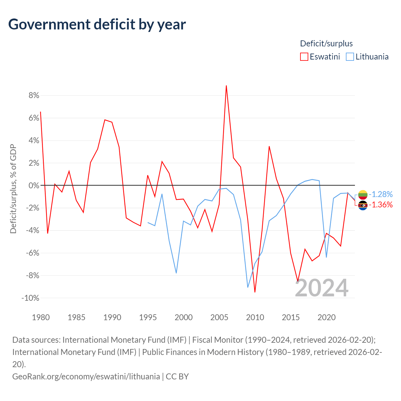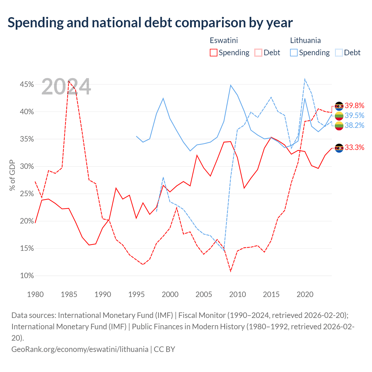 Eswatini has $1.93B in government debt (39.8% of GDP), compared to $32.4B (38.2% of GDP) in Lithuania.