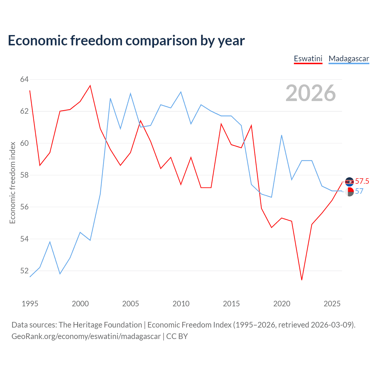 The Economic Freedom Index for Eswatini is 57.5, ranking 116/197, compared to 57 for Madagascar, ranking 119/197. The chart above displays a comparison of annual changes in economic freedom indexes.