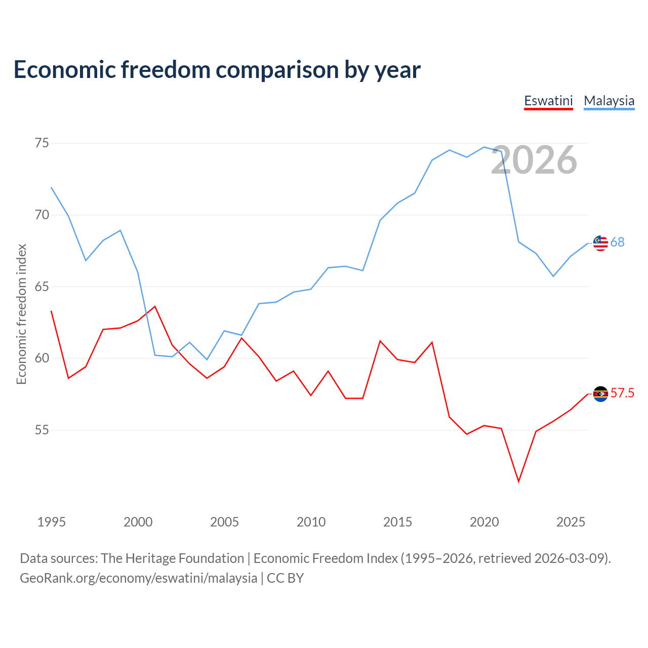 The Economic Freedom Index for Eswatini is 57.5, ranking 116/197, compared to 68 for Malaysia, ranking 51/197. The chart above displays a comparison of annual changes in economic freedom indexes.