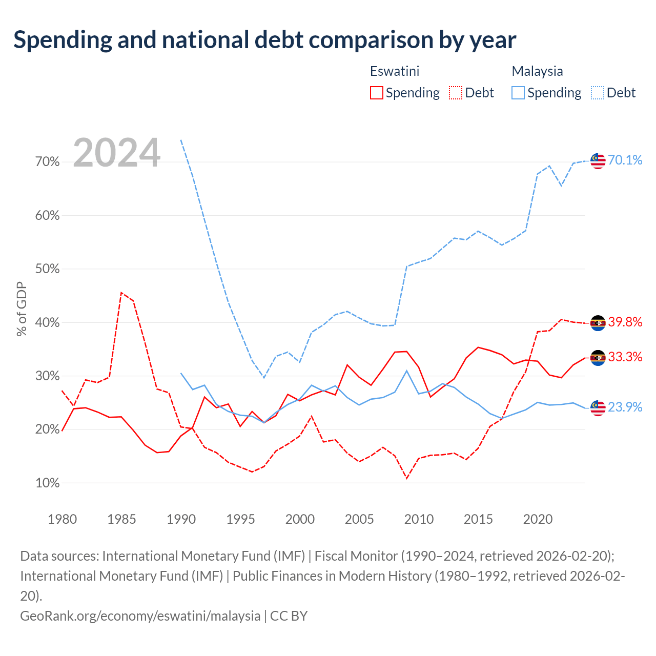 Eswatini has $1.93B in government debt (39.8% of GDP), compared to $296B (70.1% of GDP) in Malaysia.