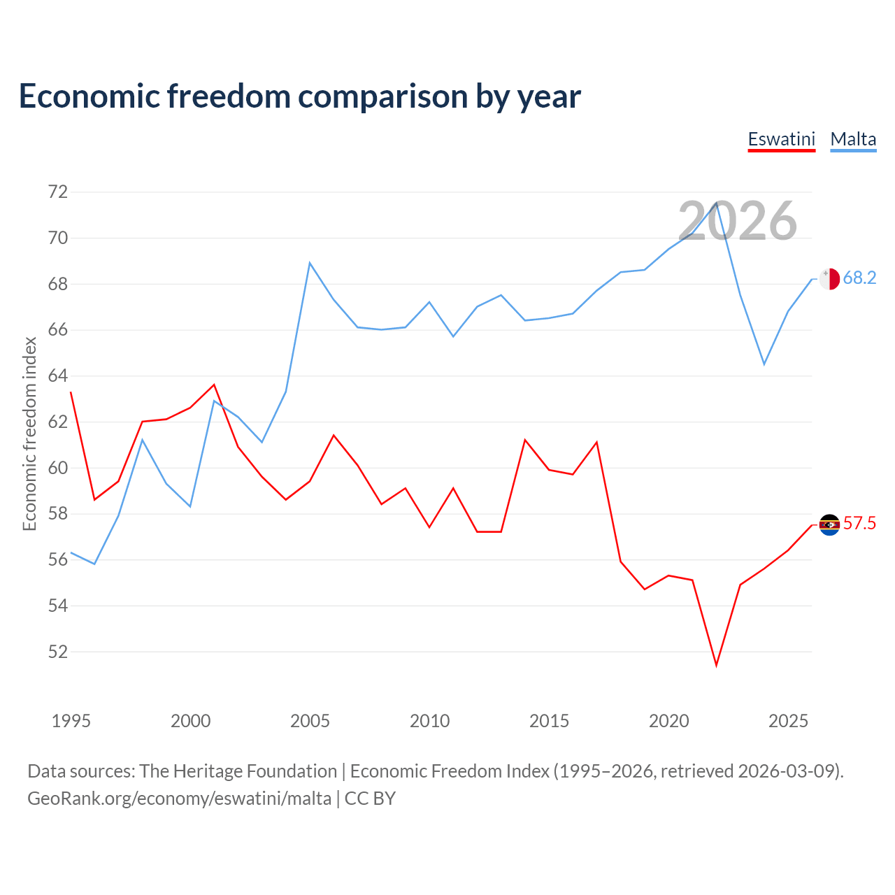 The Economic Freedom Index for Eswatini is 57.5, ranking 116/197, compared to 68.2 for Malta, ranking 49/197. The chart above displays a comparison of annual changes in economic freedom indexes.