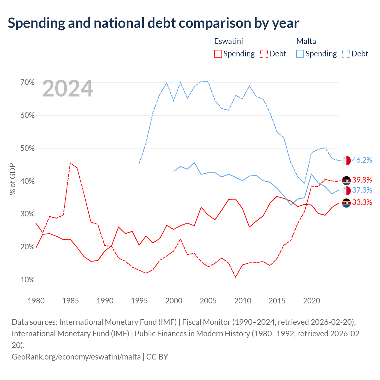 Eswatini has $1.93B in government debt (39.8% of GDP), compared to $11.5B (46.2% of GDP) in Malta.