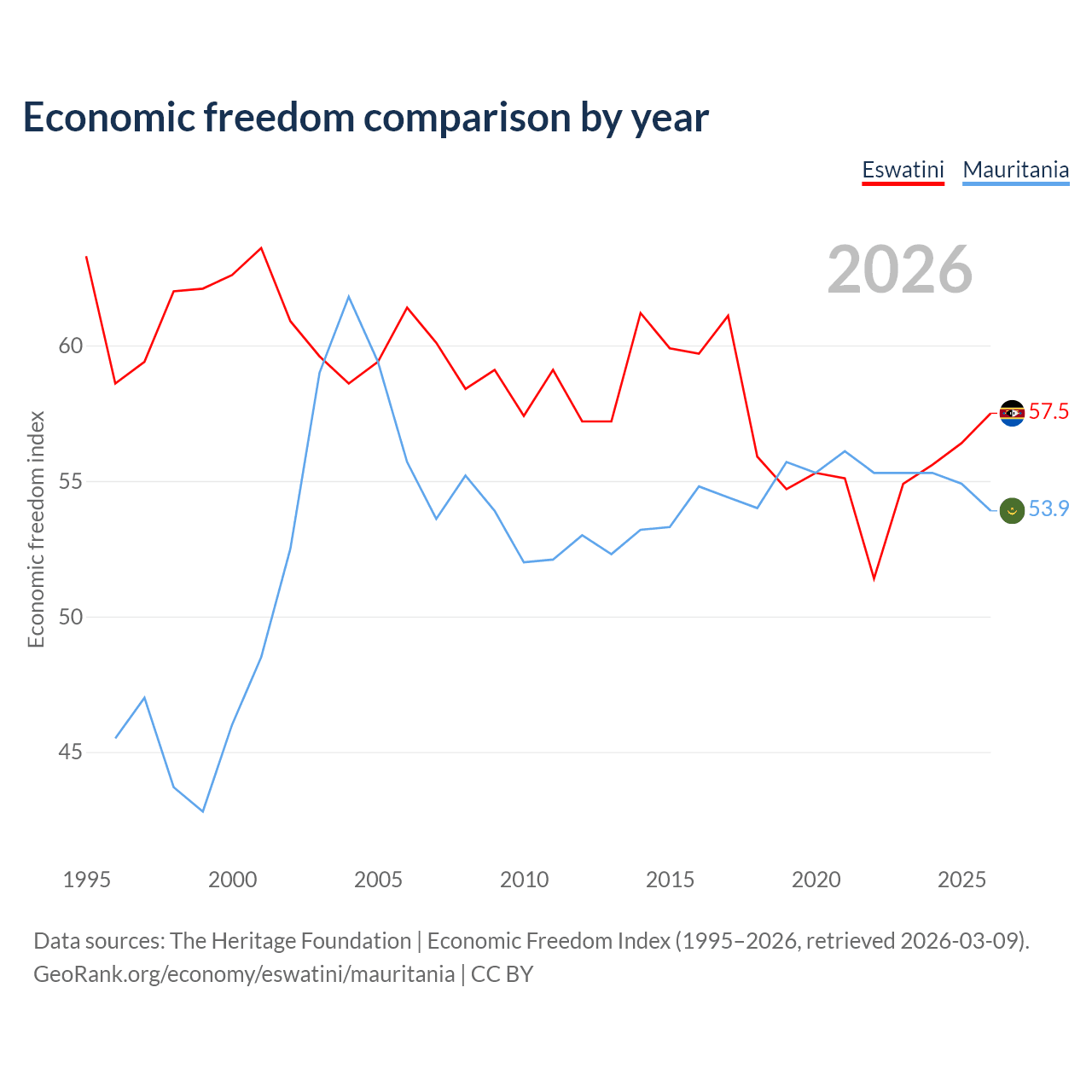 The Economic Freedom Index for Eswatini is 57.5, ranking 116/197, compared to 53.9 for Mauritania, ranking 136/197. The chart above displays a comparison of annual changes in economic freedom indexes.