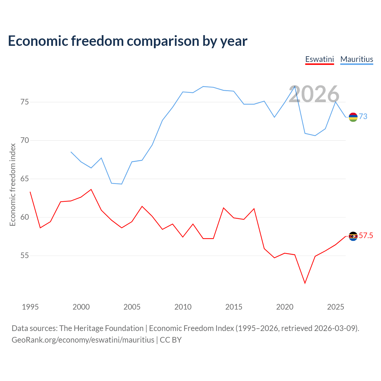 The Economic Freedom Index for Eswatini is 57.5, ranking 116/197, compared to 73 for Mauritius, ranking 26/197. The chart above displays a comparison of annual changes in economic freedom indexes.
