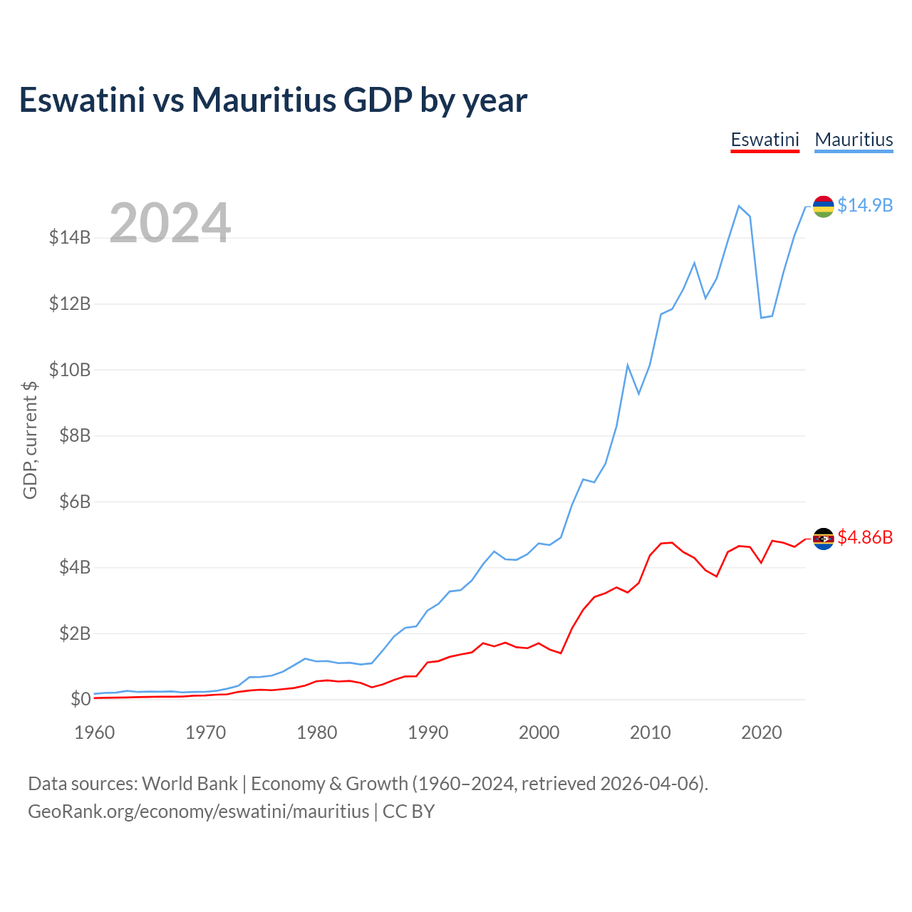 Eswatini has a GDP of $4.86B compared to $14.9B for Mauritius, ranking 162/197 and 143/197 by economy size, respectively.