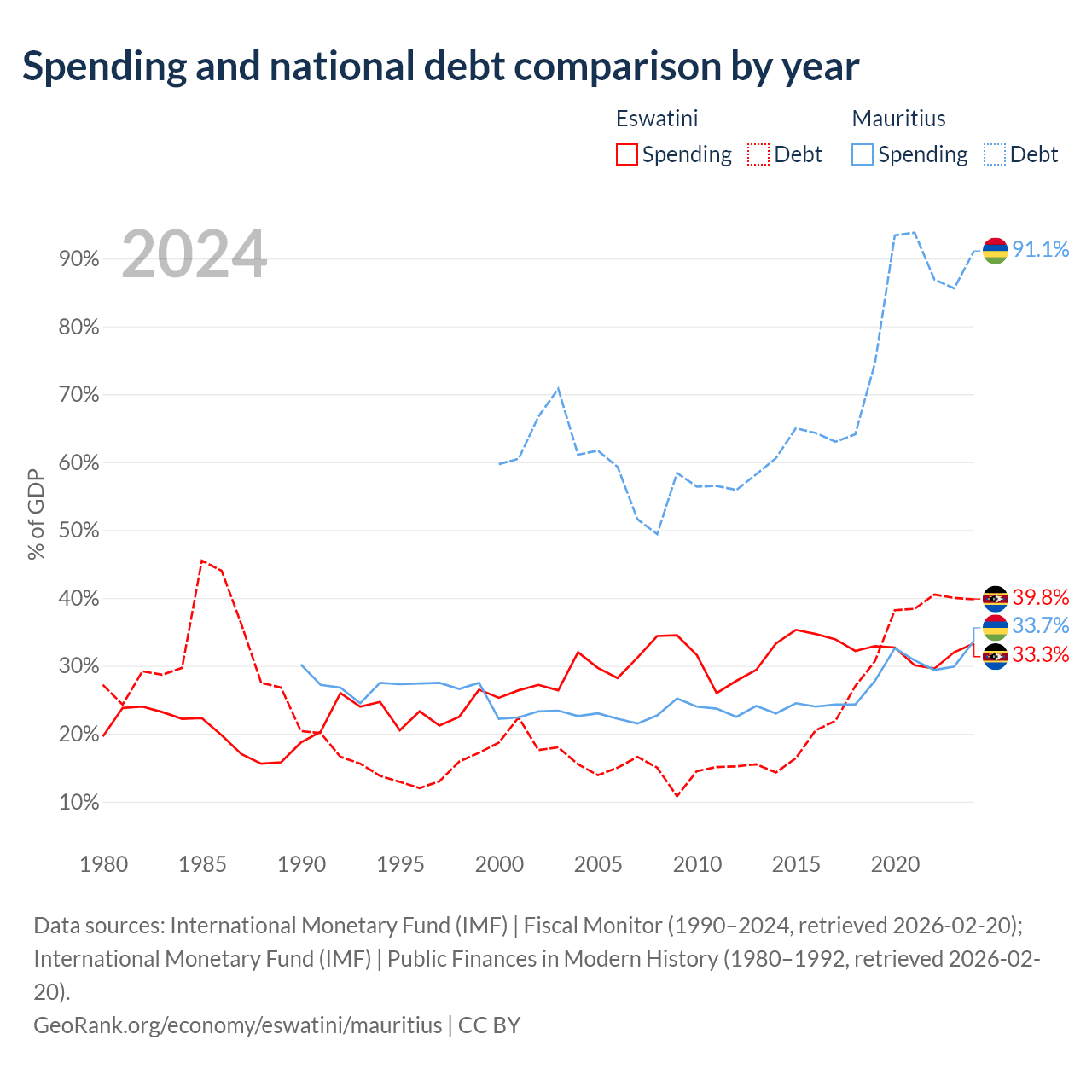 Eswatini has $1.93B in government debt (39.8% of GDP), compared to $13.6B (91.1% of GDP) in Mauritius.