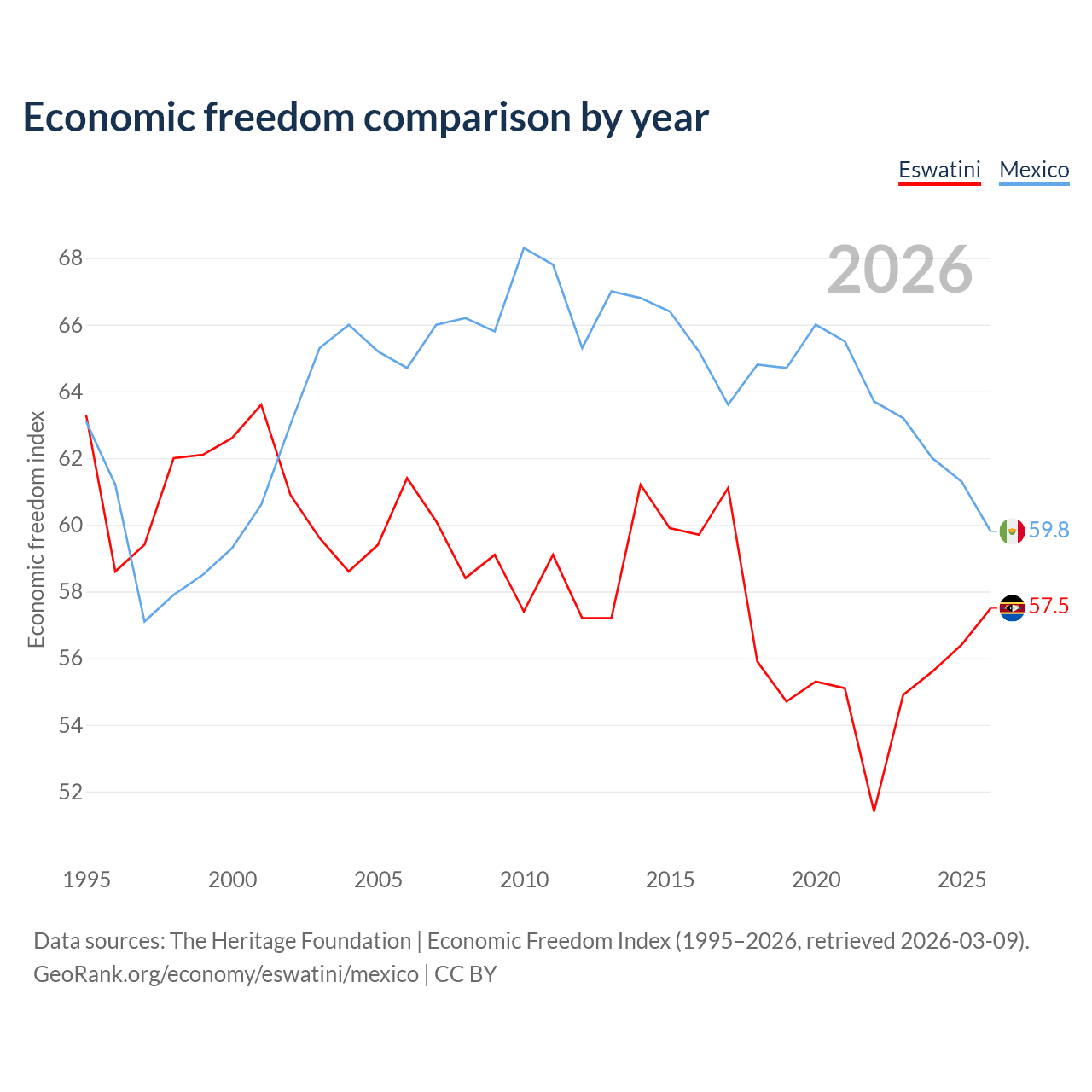 The Economic Freedom Index for Eswatini is 57.5, ranking 116/197, compared to 59.8 for Mexico, ranking 102/197. The chart above displays a comparison of annual changes in economic freedom indexes.