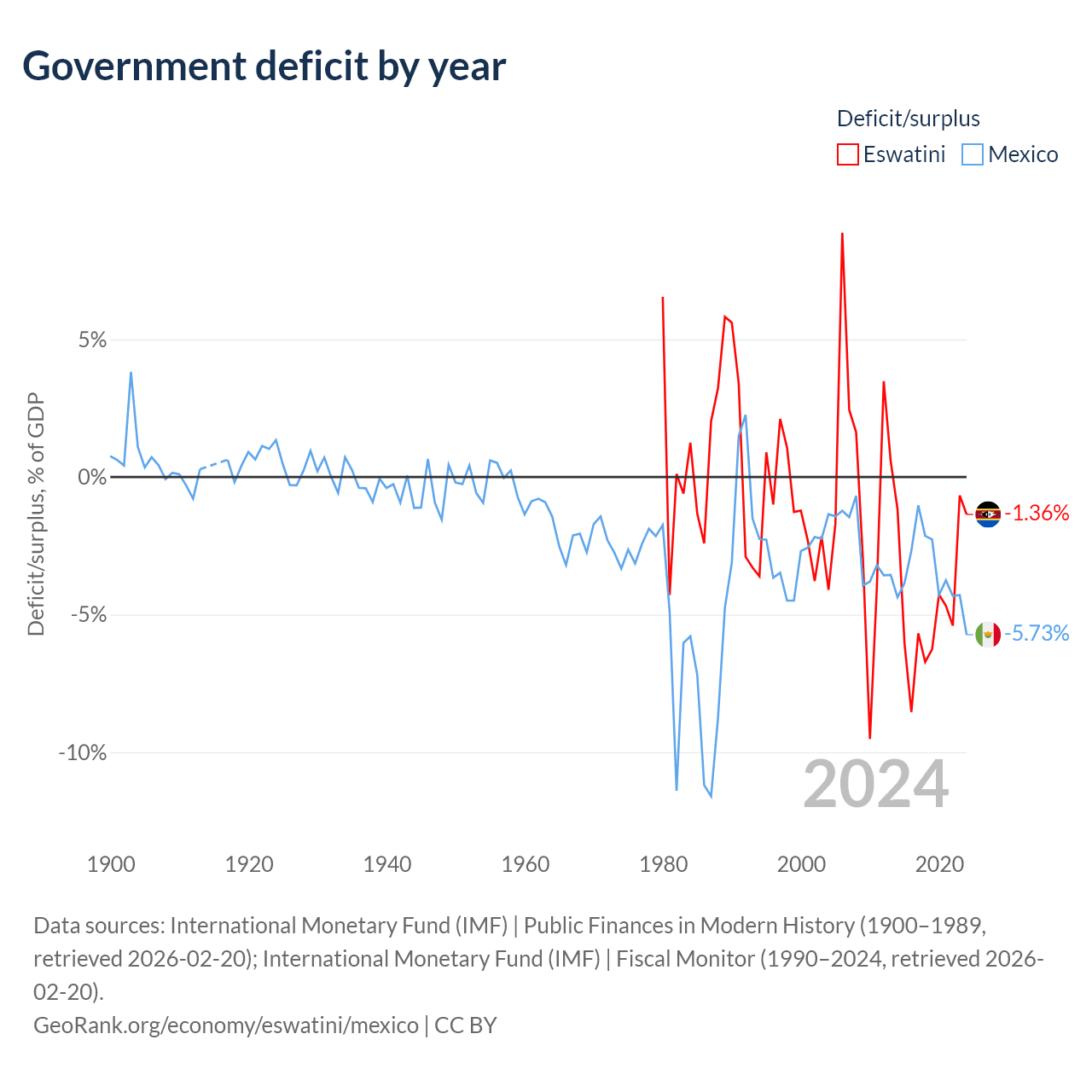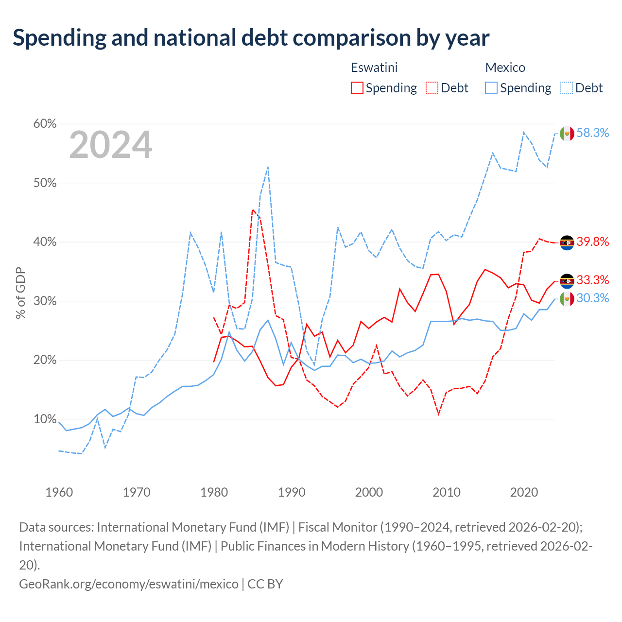 Eswatini has $1.93B in government debt (39.8% of GDP), compared to $1.08T (58.3% of GDP) in Mexico.