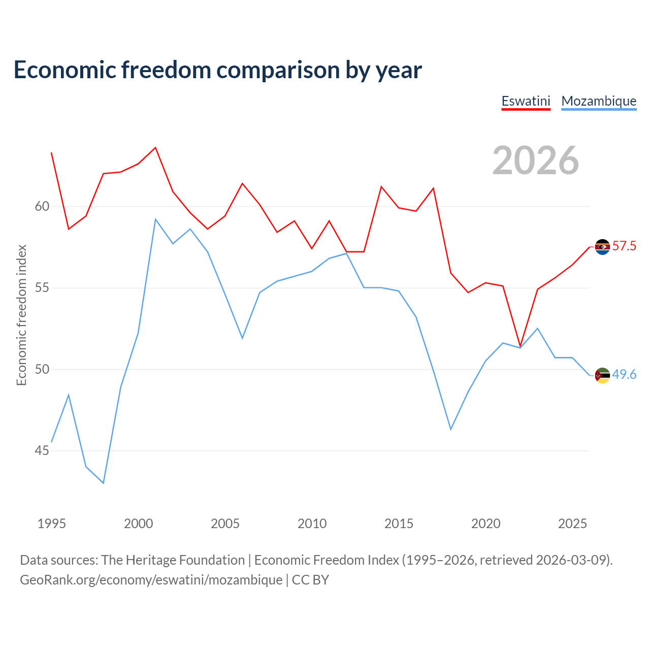 The Economic Freedom Index for Eswatini is 57.5, ranking 116/197, compared to 49.6 for Mozambique, ranking 164/197. The chart above displays a comparison of annual changes in economic freedom indexes.