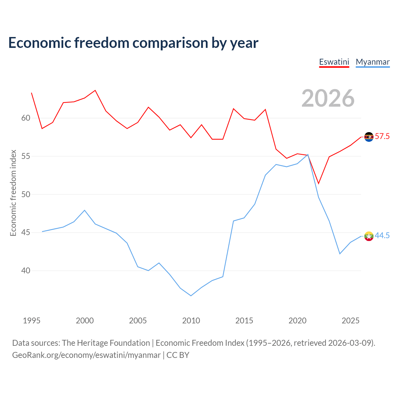 The Economic Freedom Index for Eswatini is 57.5, ranking 116/197, compared to 44.5 for Myanmar, ranking 180/197. The chart above displays a comparison of annual changes in economic freedom indexes.