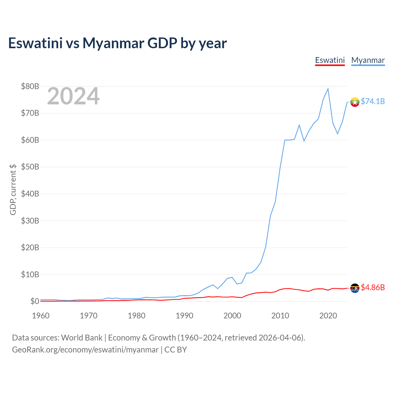 Eswatini has a GDP of $4.86B compared to $74.1B for Myanmar, ranking 162/197 and 85/197 by economy size, respectively.