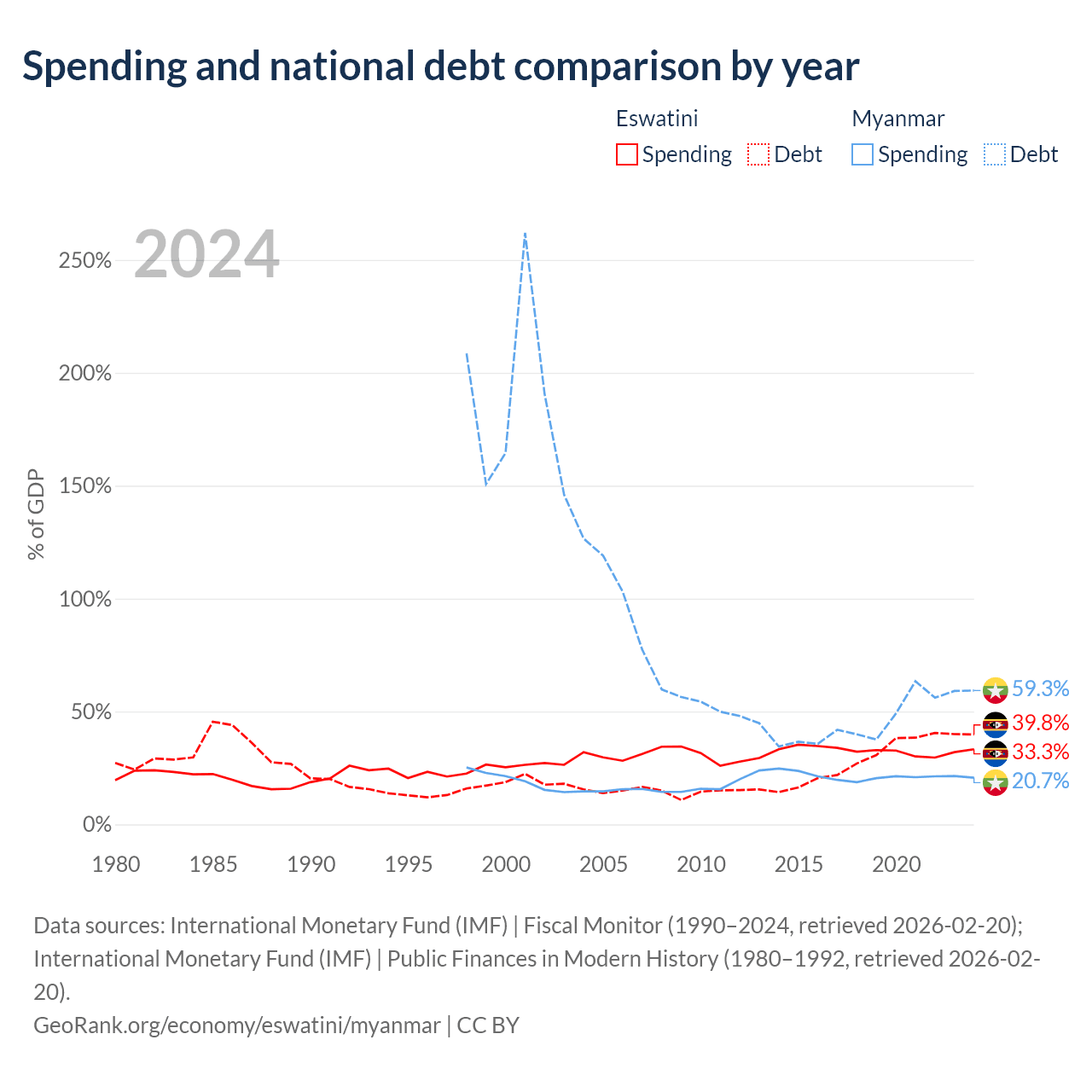 Eswatini has $1.93B in government debt (39.8% of GDP), compared to $44B (59.3% of GDP) in Myanmar.
