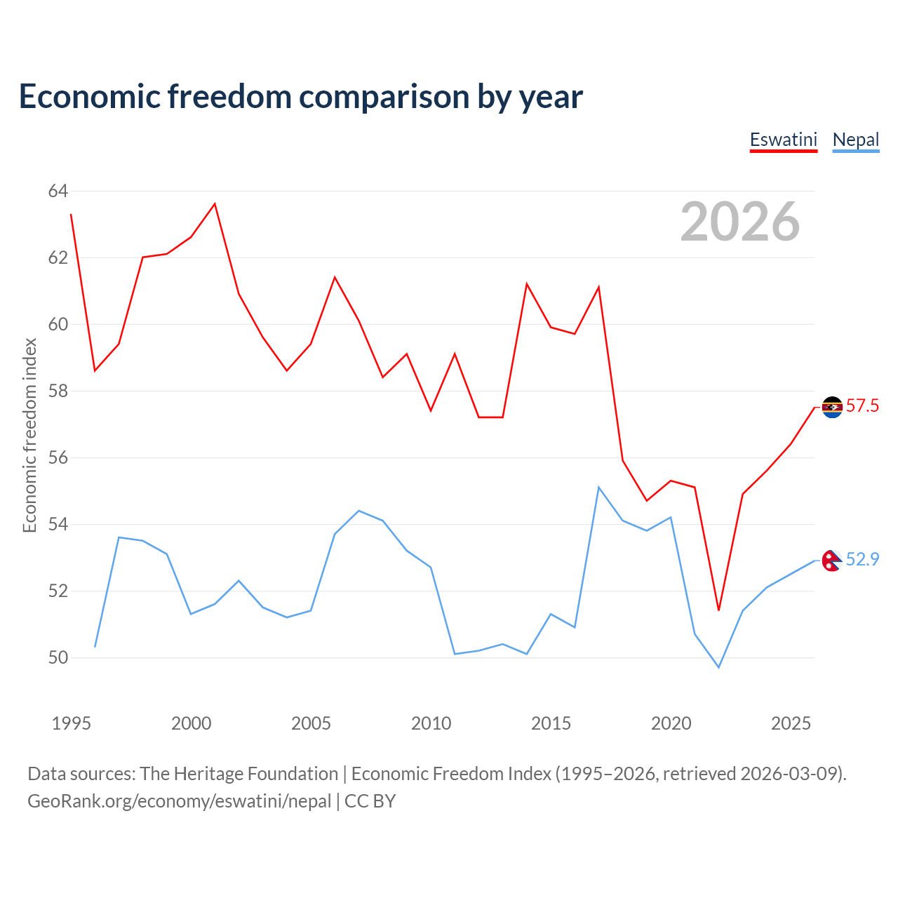 The Economic Freedom Index for Eswatini is 57.5, ranking 116/197, compared to 52.9 for Nepal, ranking 144/197. The chart above displays a comparison of annual changes in economic freedom indexes.