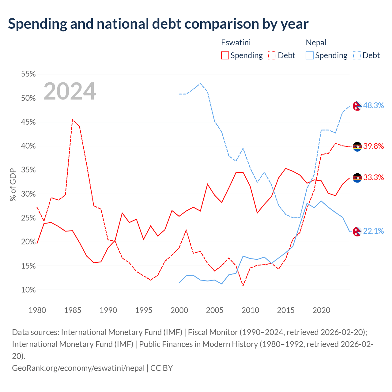 Eswatini has $1.93B in government debt (39.8% of GDP), compared to $20.7B (48.3% of GDP) in Nepal.