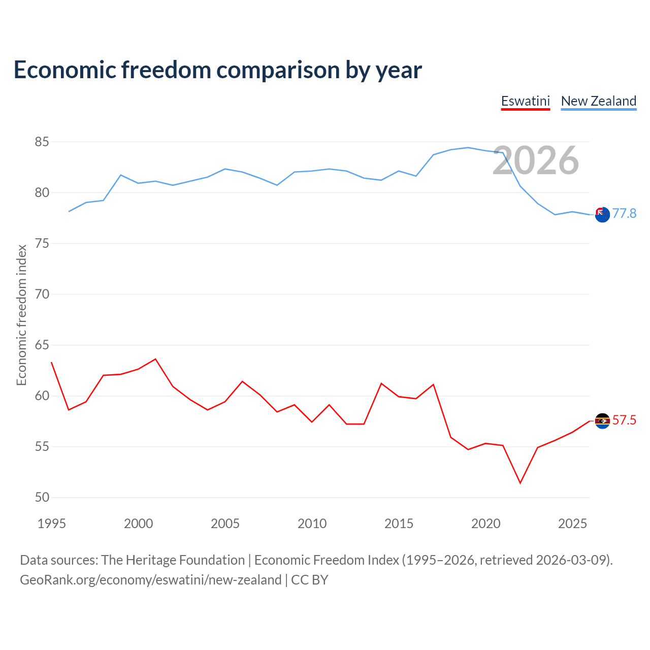 The Economic Freedom Index for Eswatini is 57.5, ranking 116/197, compared to 77.8 for New Zealand, ranking 13/197. The chart above displays a comparison of annual changes in economic freedom indexes.