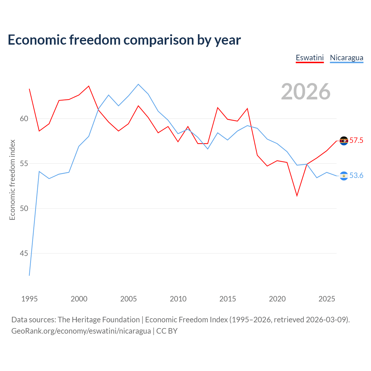 The Economic Freedom Index for Eswatini is 57.5, ranking 116/197, compared to 53.6 for Nicaragua, ranking 139/197. The chart above displays a comparison of annual changes in economic freedom indexes.