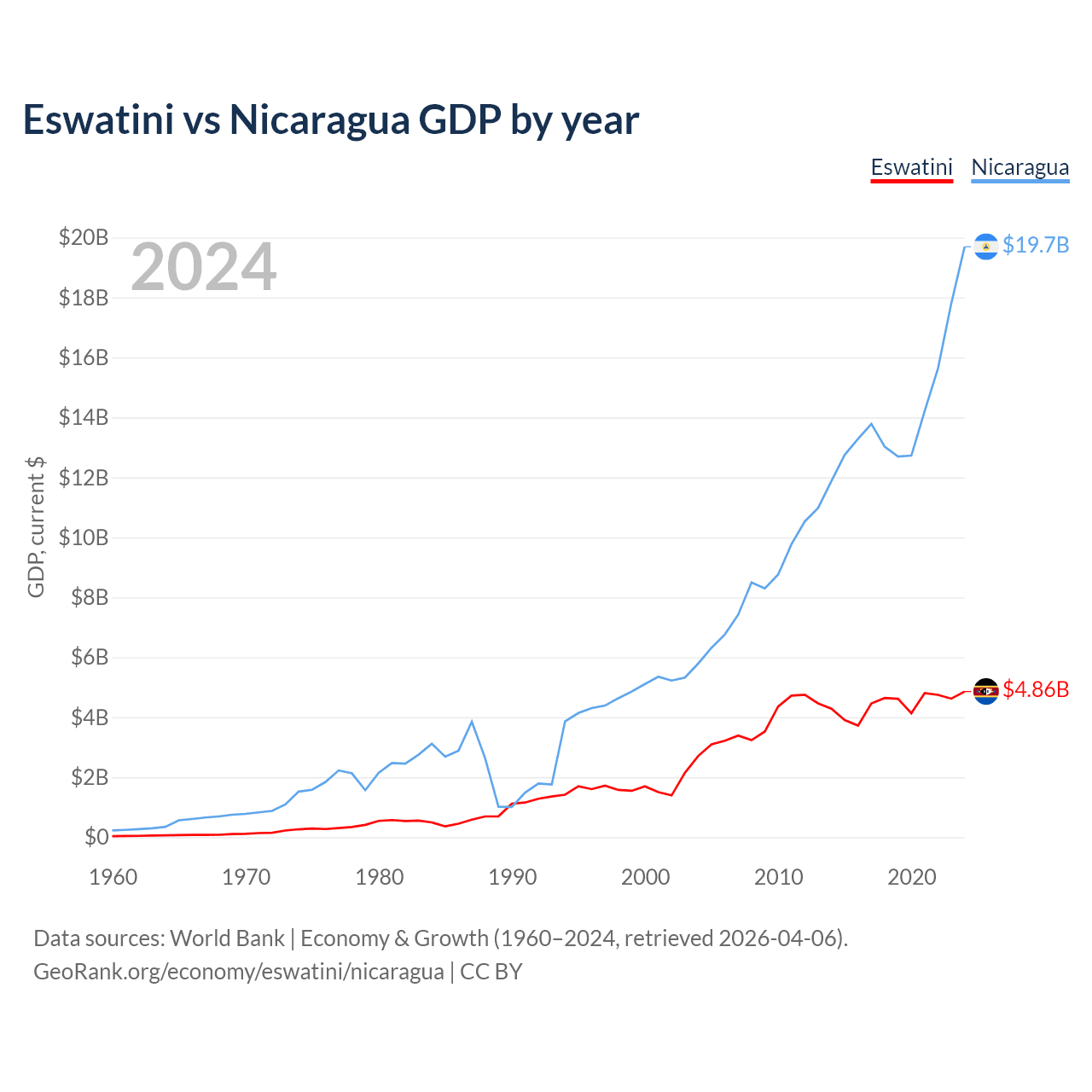 Eswatini has a GDP of $4.86B compared to $19.7B for Nicaragua, ranking 162/197 and 131/197 by economy size, respectively.
