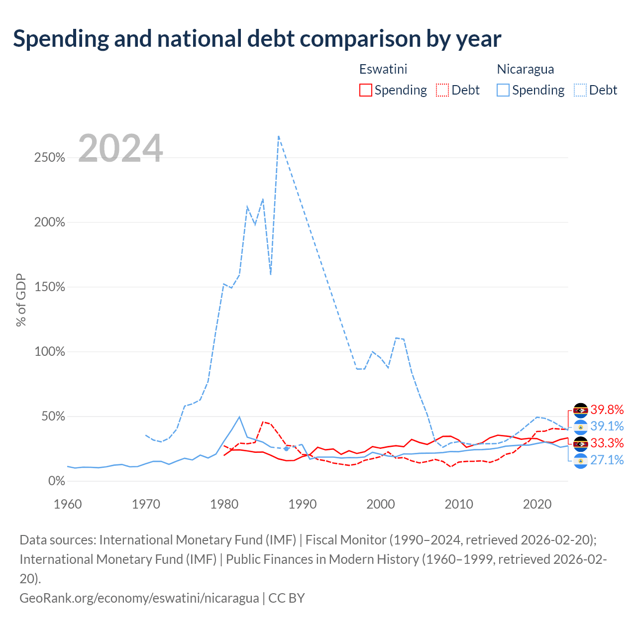 Eswatini has $1.93B in government debt (39.8% of GDP), compared to $7.71B (39.1% of GDP) in Nicaragua.