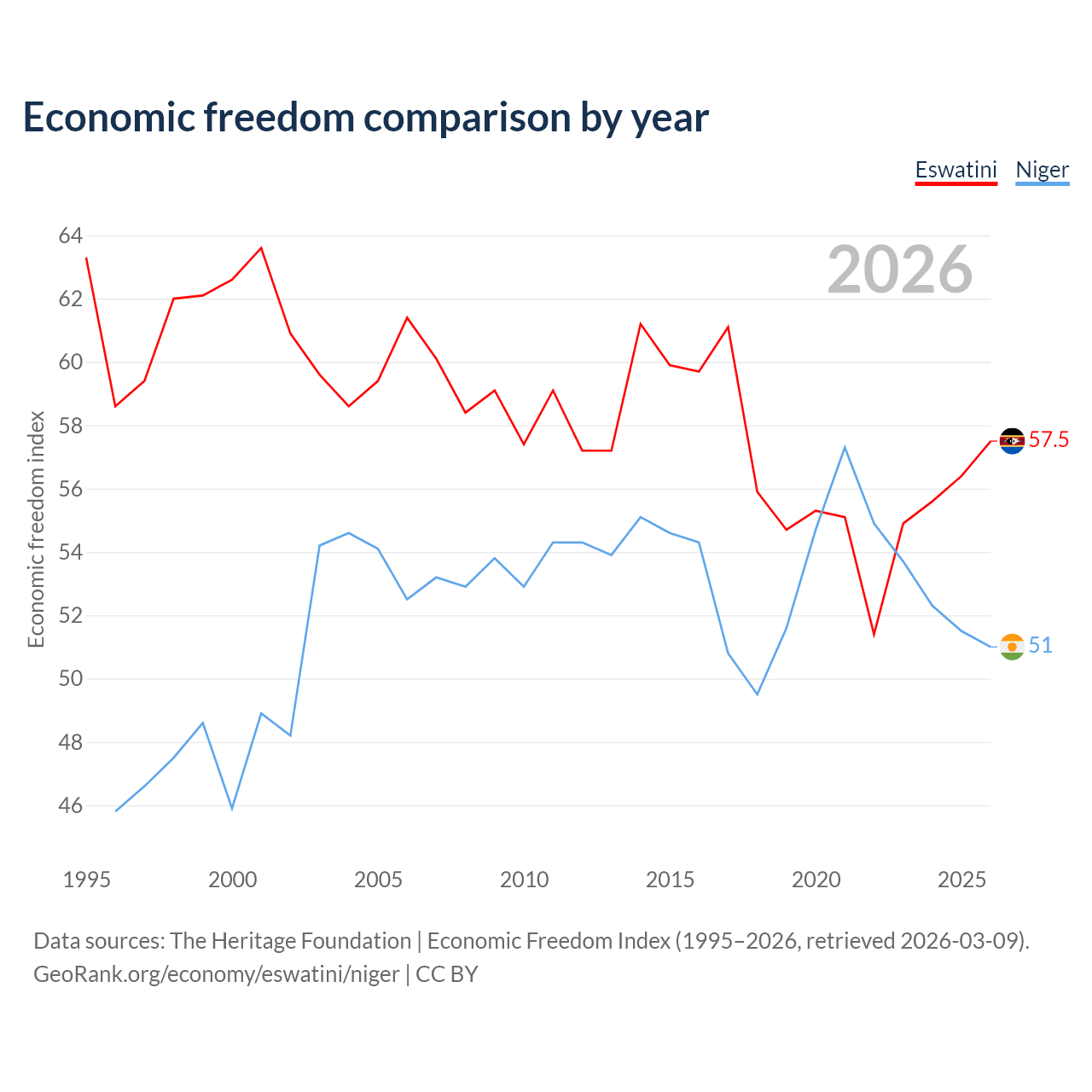 The Economic Freedom Index for Eswatini is 57.5, ranking 116/197, compared to 51 for Niger, ranking 156/197. The chart above displays a comparison of annual changes in economic freedom indexes.