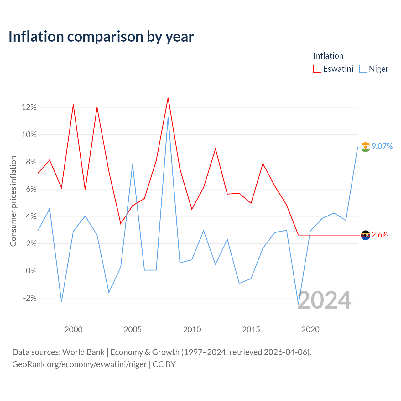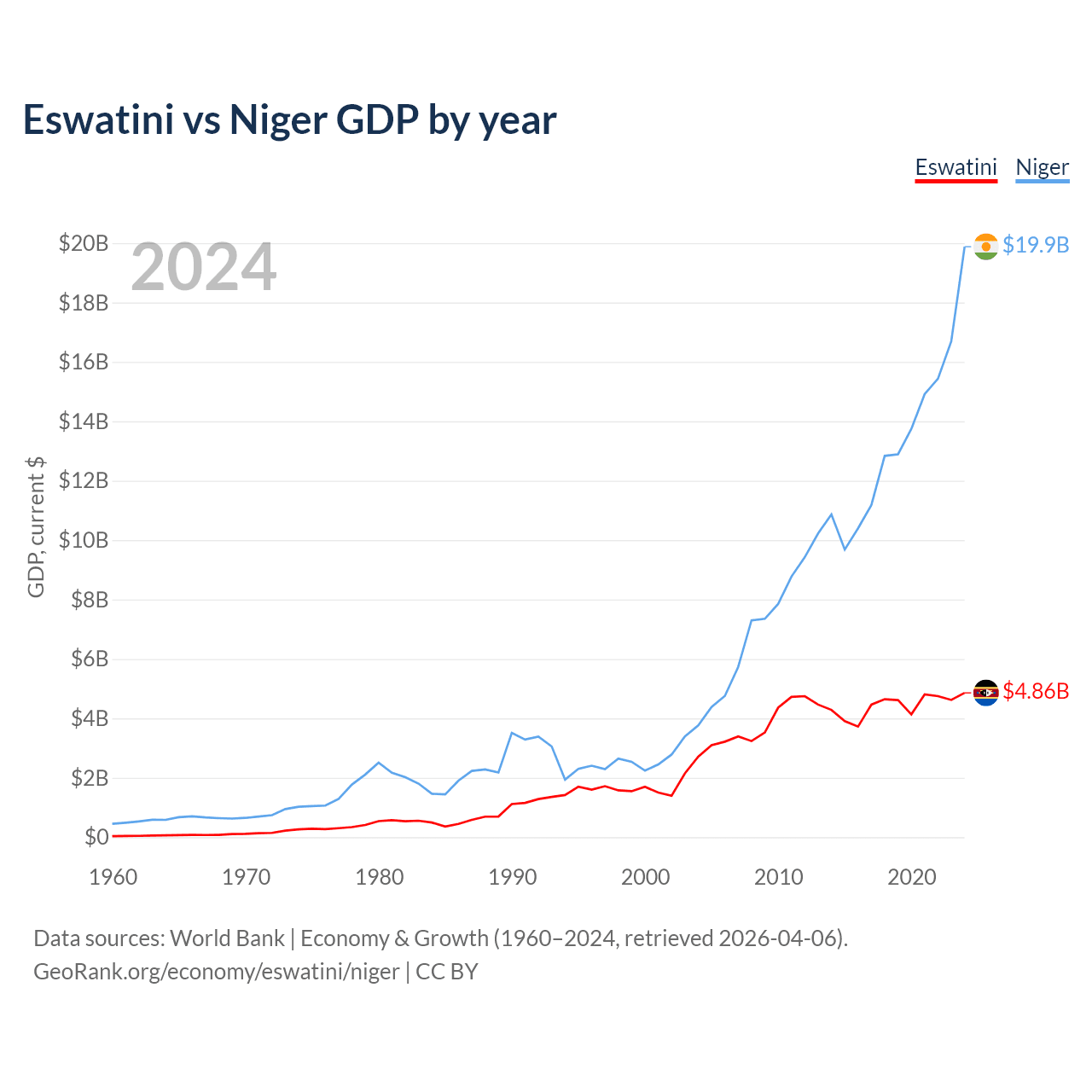 Eswatini has a GDP of $4.86B compared to $19.9B for Niger, ranking 162/197 and 130/197 by economy size, respectively.