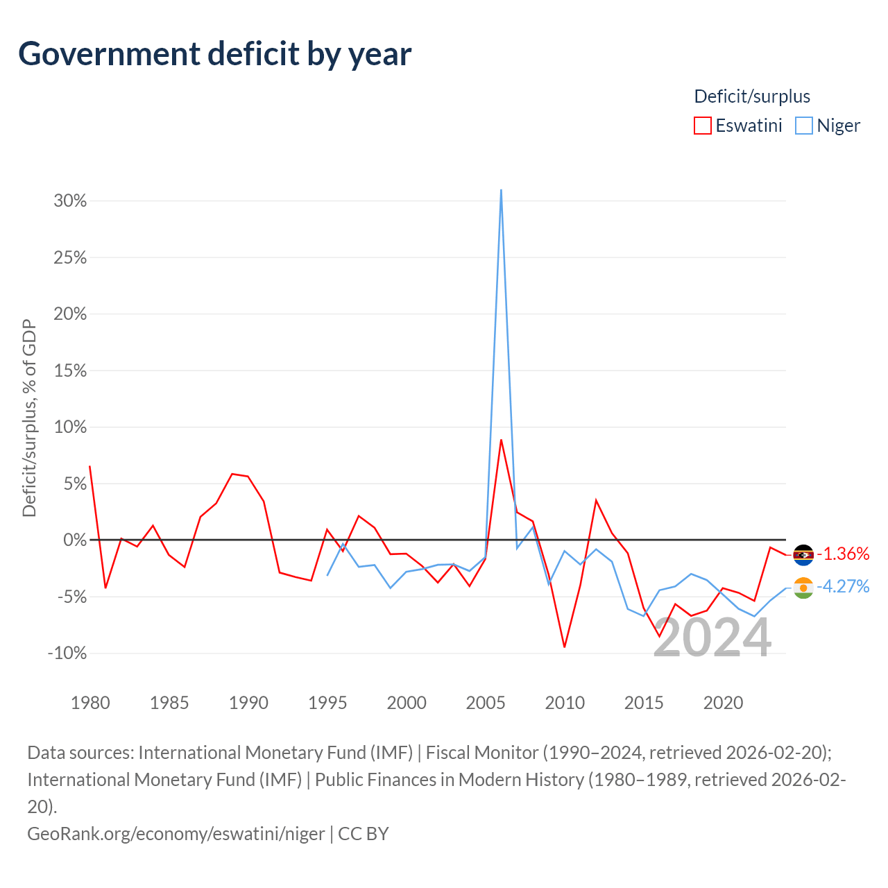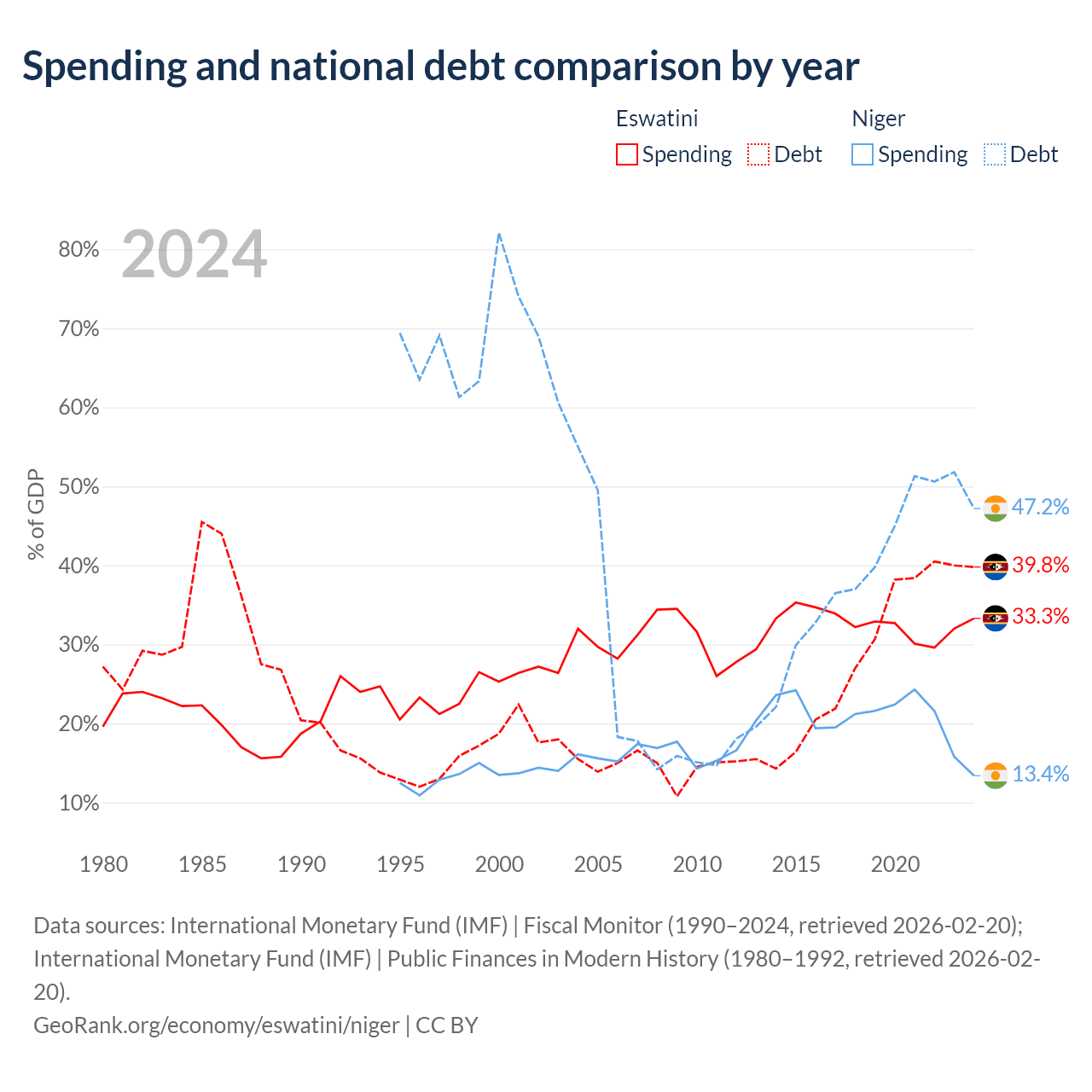 Eswatini has $1.93B in government debt (39.8% of GDP), compared to $9.39B (47.2% of GDP) in Niger.