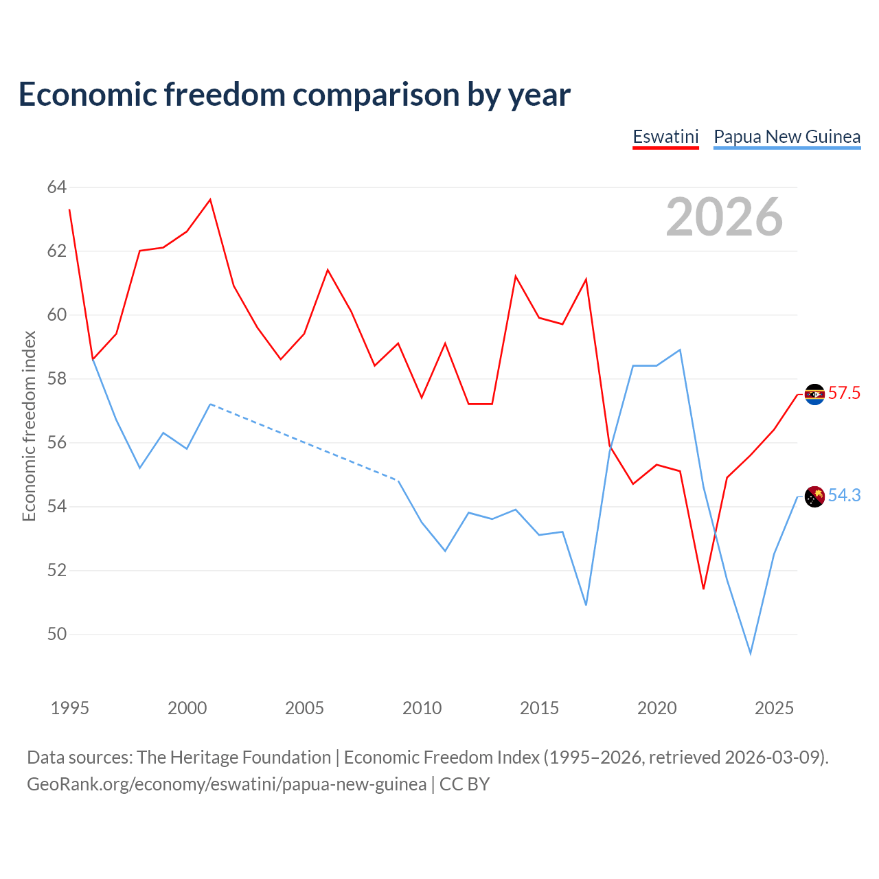 The Economic Freedom Index for Eswatini is 57.5, ranking 116/197, compared to 54.3 for Papua New Guinea, ranking 134/197. The chart above displays a comparison of annual changes in economic freedom indexes.