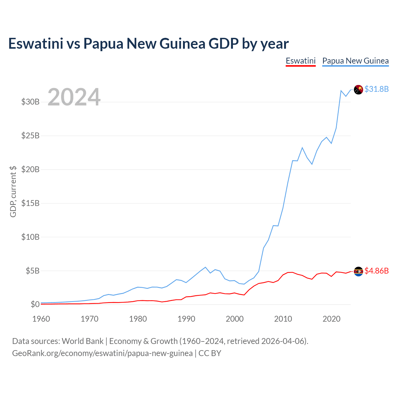 Eswatini has a GDP of $4.86B compared to $31.8B for Papua New Guinea, ranking 162/197 and 110/197 by economy size, respectively.