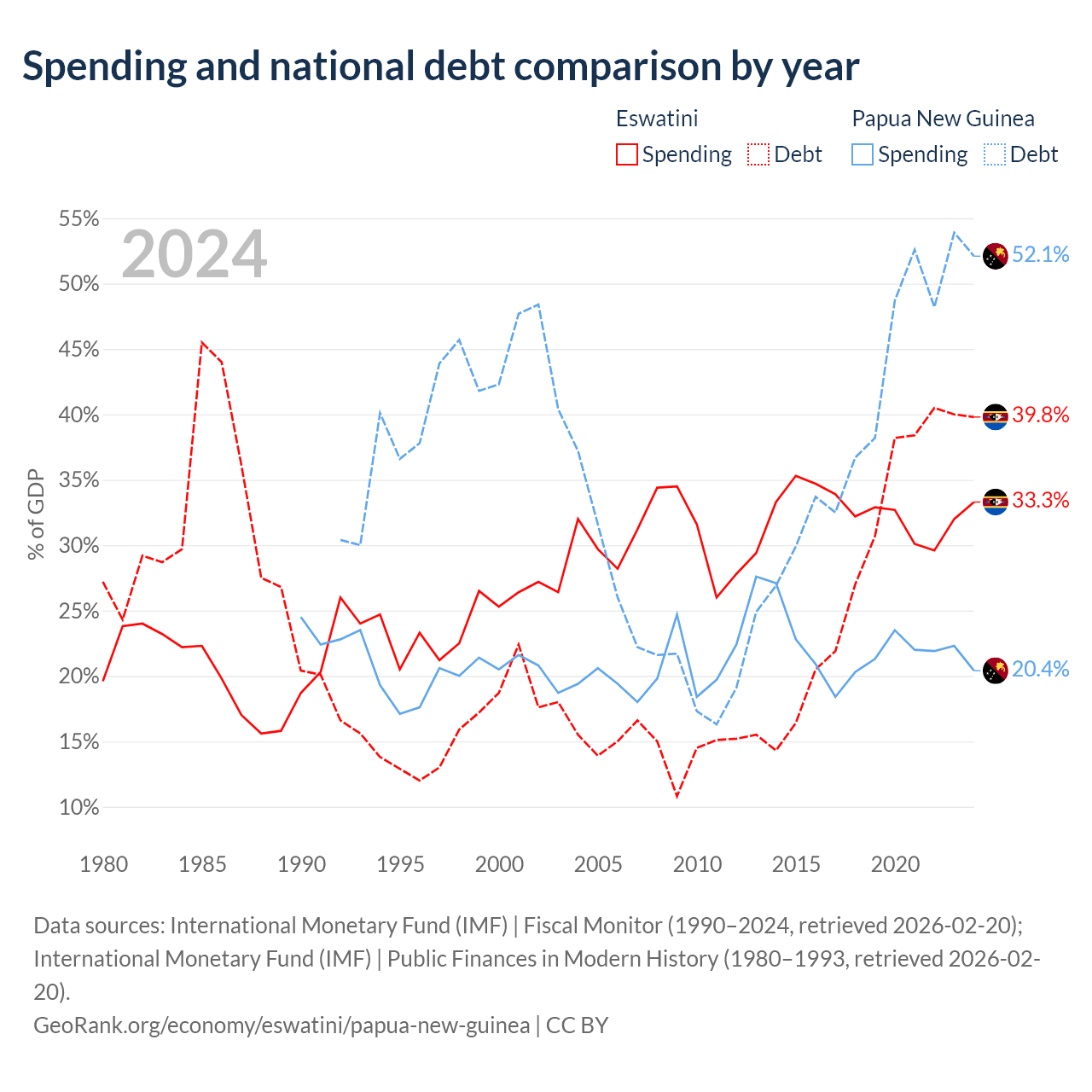Eswatini has $1.93B in government debt (39.8% of GDP), compared to $16.6B (52.1% of GDP) in Papua New Guinea.