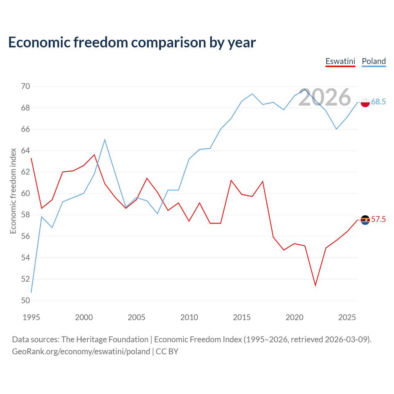 The Economic Freedom Index for Eswatini is 57.5, ranking 116/197, compared to 68.5 for Poland, ranking 46/197. The chart above displays a comparison of annual changes in economic freedom indexes.