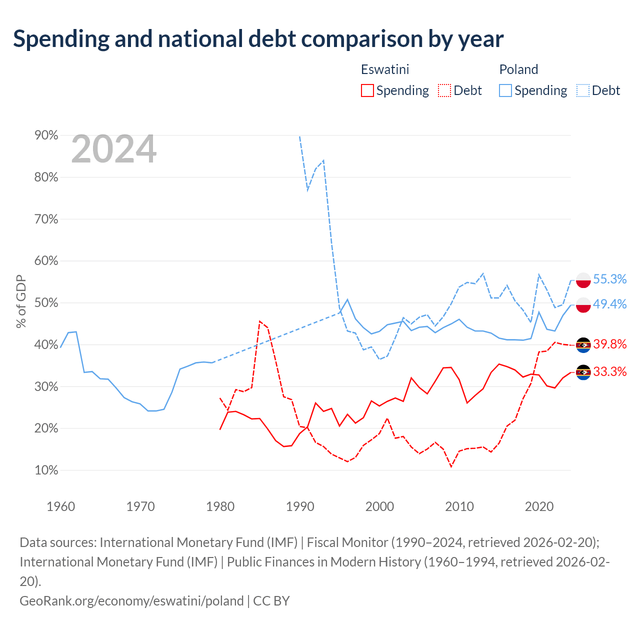 Eswatini has $1.93B in government debt (39.8% of GDP), compared to $507B (55.3% of GDP) in Poland.