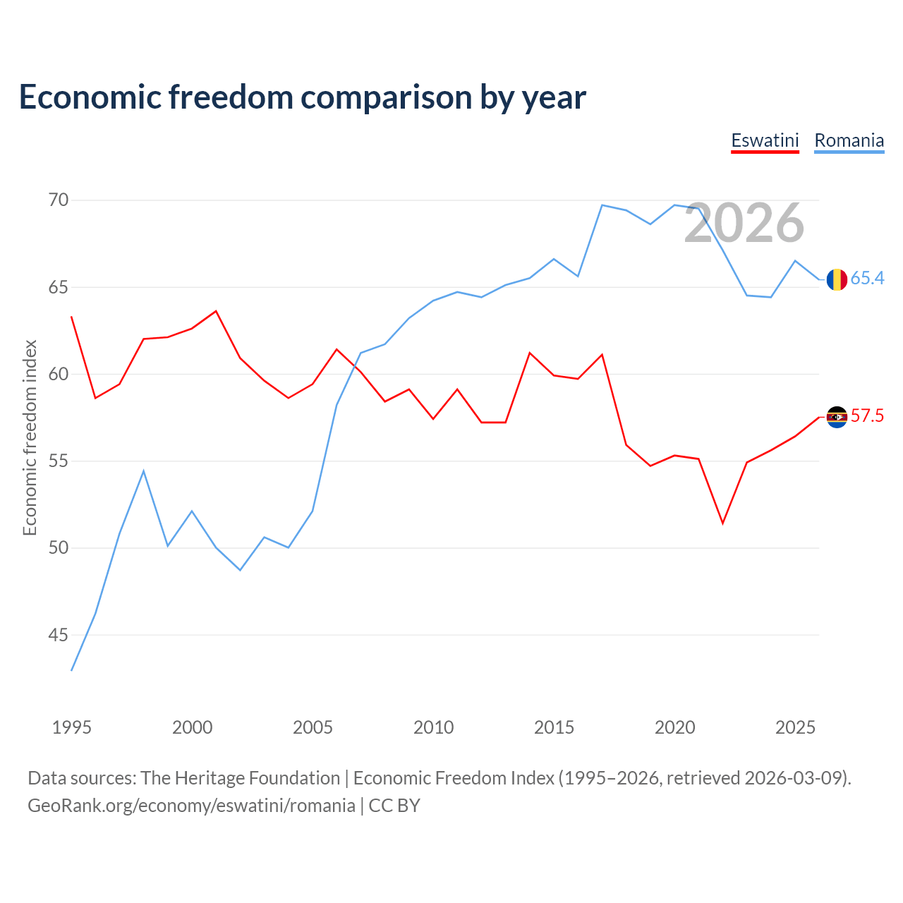 The Economic Freedom Index for Eswatini is 57.5, ranking 116/197, compared to 65.4 for Romania, ranking 64/197. The chart above displays a comparison of annual changes in economic freedom indexes.