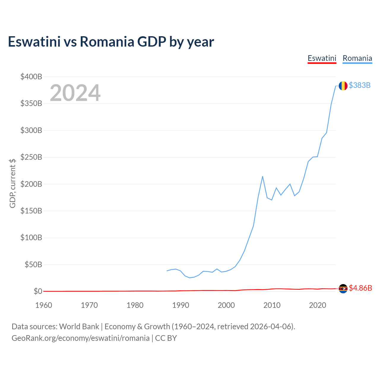 Eswatini has a GDP of $4.86B compared to $383B for Romania, ranking 162/197 and 42/197 by economy size, respectively.