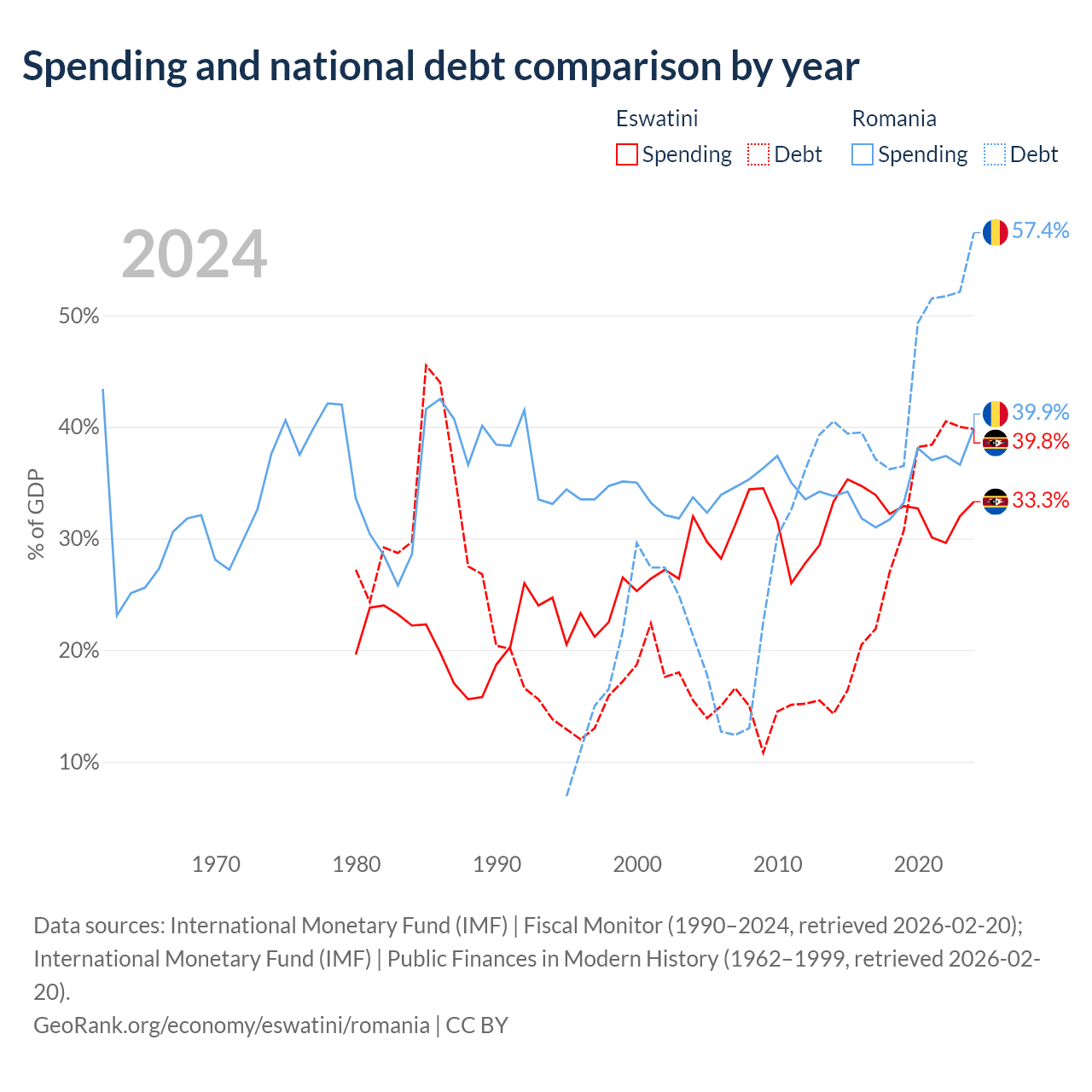 Eswatini has $1.93B in government debt (39.8% of GDP), compared to $220B (57.4% of GDP) in Romania.