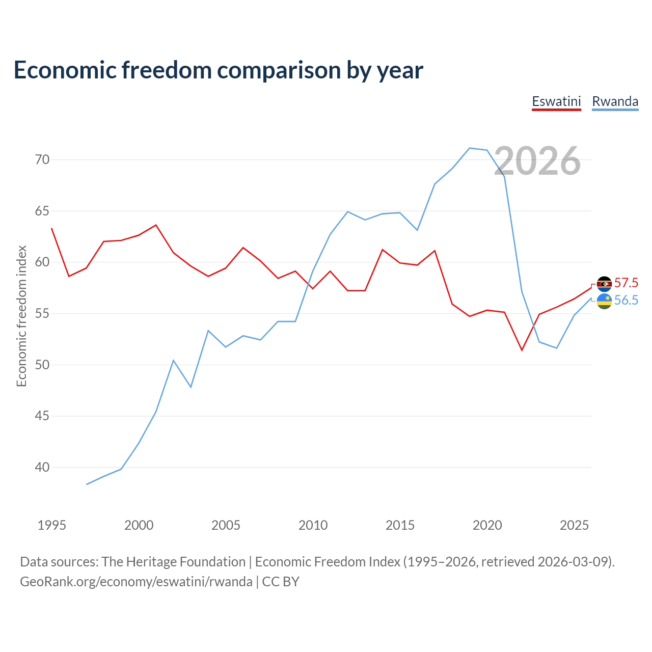 The Economic Freedom Index for Eswatini is 57.5, ranking 116/197, compared to 56.5 for Rwanda, ranking 121/197. The chart above displays a comparison of annual changes in economic freedom indexes.