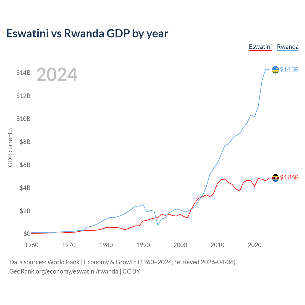 Eswatini has a GDP of $4.86B compared to $14.3B for Rwanda, ranking 162/197 and 144/197 by economy size, respectively.